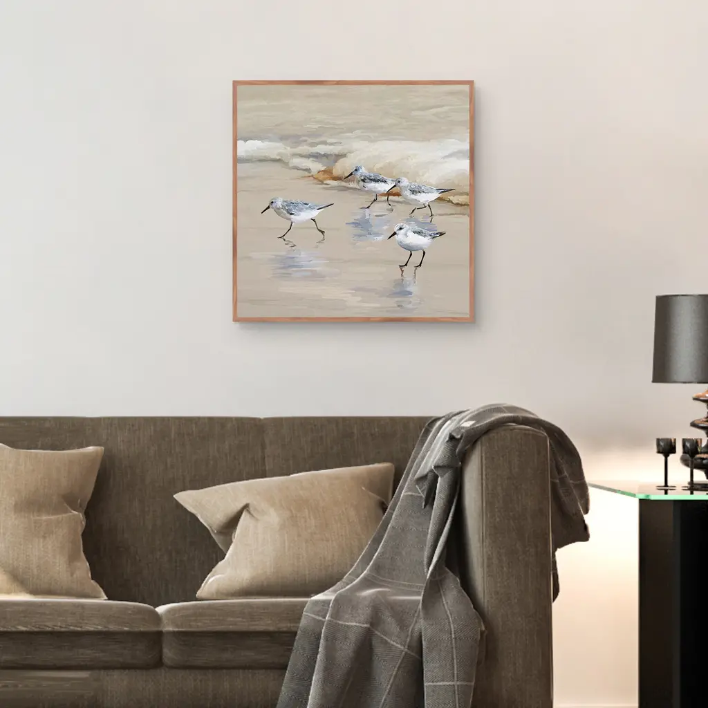 A flock of sandpipers scurries away from the oncoming tide in this charming and unique coastal print. Produced with full-bleed printing that covers the entirety of the canvas, your new masterpiece is made with state-of-the-art technology for that museum-quality look. Plus, your new masterpiece comes ready to hang and is surrounded by a stylish, hand-crafted frame that enhances the beauty of your new artwork.