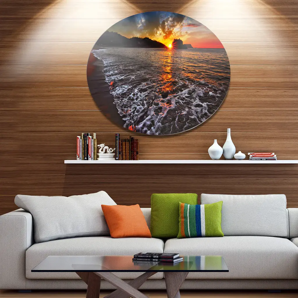 Bring Contemporary Abstraction to your home with this large Circle Metal wall art. This Sandy Beach with Lovely Waves Metal Artwork makes it the focal point of any room or office. - White Gloss Coating ensures colors are extra vibrant with light reflection.- Aluminum grade Sheet Metal with 1 inch mounting frame on the back giving the illusion that the artwork is floating on the wall..- Mounting Brackets are included along with instructions.- High Quality Digital images are created directly into a glossy aluminum panel producing a stunning and captivating print into the glossy finish of the metal.- Water, Fire and Scratch resistant HD Aluminum panels.- Looks better than any photo paper and guaranteed to last at least 20 years- Easy to clean with a microfiber cloth. Colors are far superior to regular Canvas Art. - Easy to Hang