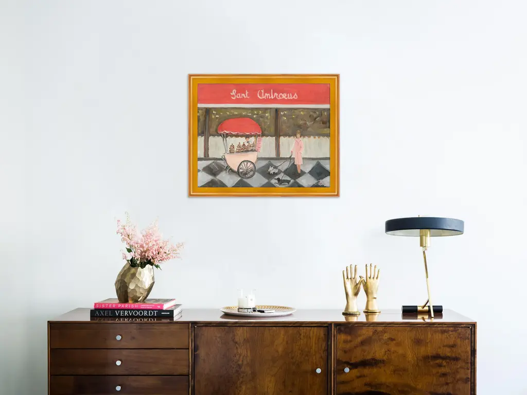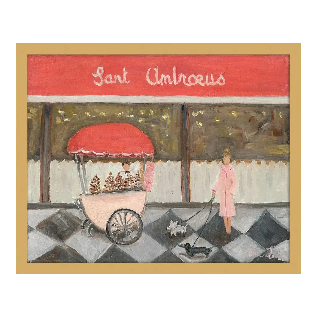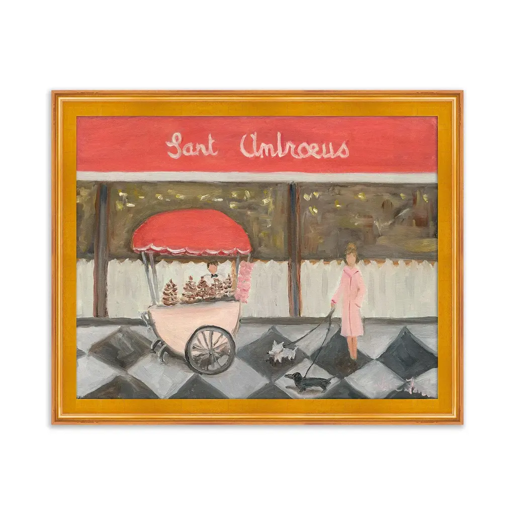 DESCRIPTION: Sant Ambroeus by Alice Ford in Gold Frame, Small Art Print SPECIFICATIONS: Type: Giclée Art Print on Matte Paper. Overall Size (in): 24x19.5. Image Size (in): 21x16.5. Orientation: Horizontal. Flush/Float/Matted: Flush. Frame Color: Gold. Hanging Hardware: Picture Perfect. FRAMING: Each art work arrives framed and ready to hang. We use handmade frames with a plexiglass glazing front, because it offers less glare than standard glass. At this time, we only offer framed prints. ARTIST BIO: Alice Ford is a California-based artist. She is known for her imaginative scenes imbued with a charming sense of Nostalgia. Alice participated in Chairish’s first in-person exhibition at Bergdorf Goodman in New York in 2023.