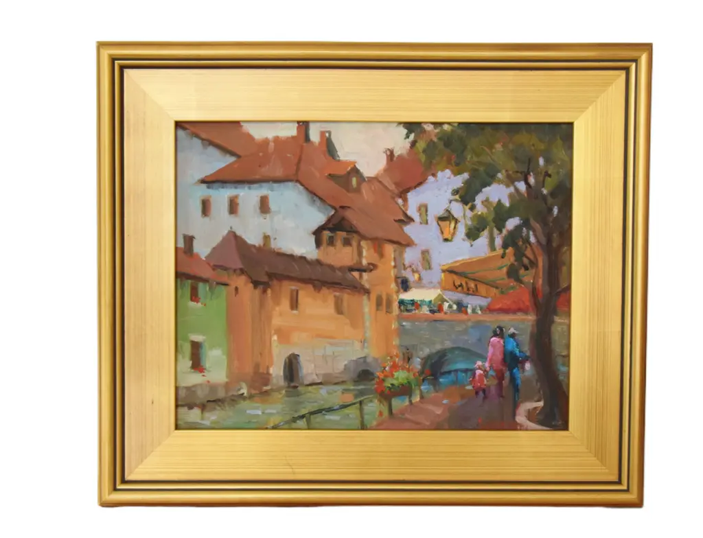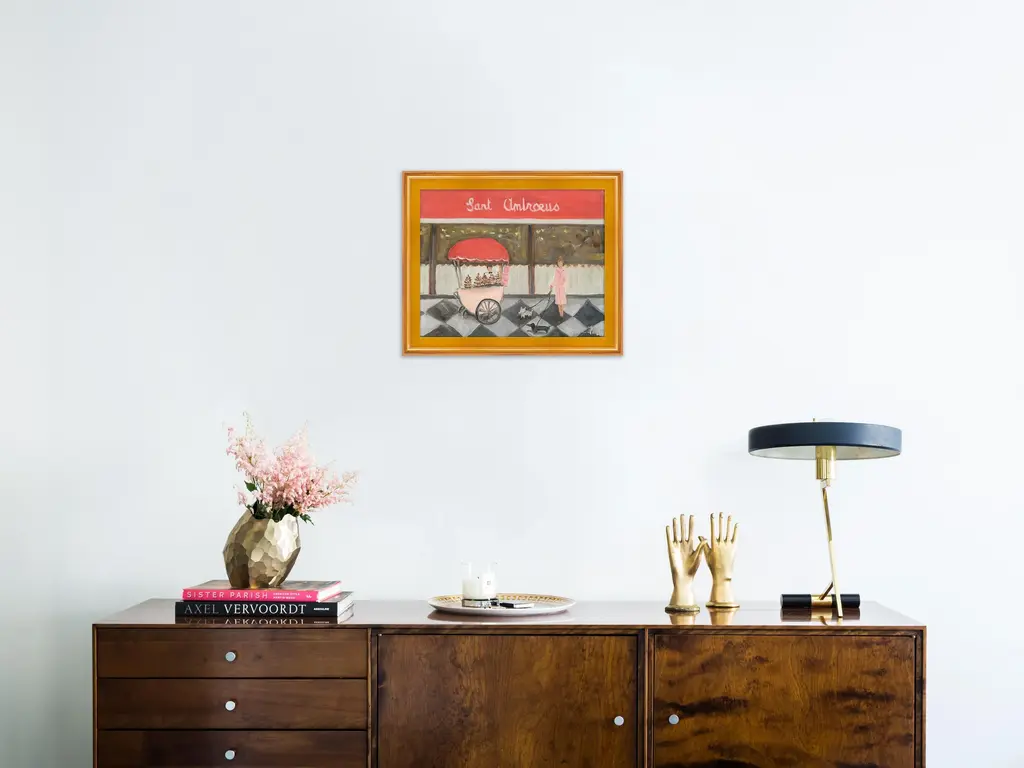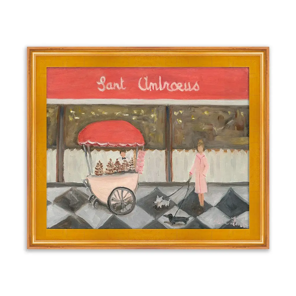 DESCRIPTION: Sant Ambroeus by Alice Ford in Gold Frame, XS Art Print SPECIFICATIONS: Type: Giclée Art Print on Matte Paper. Overall Size (in): 18x15. Image Size (in): 15x12. Orientation: Horizontal. Flush/Float/Matted: Flush. Frame Color: Gold. Hanging Hardware: Picture Perfect. FRAMING: Each art work arrives framed and ready to hang. We use handmade frames with a plexiglass glazing front, because it offers less glare than standard glass. At this time, we only offer framed prints. ARTIST BIO: Alice Ford is a California-based artist. She is known for her imaginative scenes imbued with a charming sense of Nostalgia. Alice participated in Chairish’s first in-person exhibition at Bergdorf Goodman in New York in 2023.