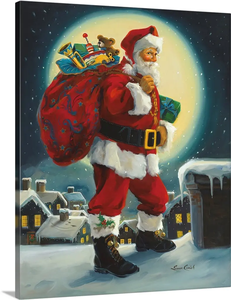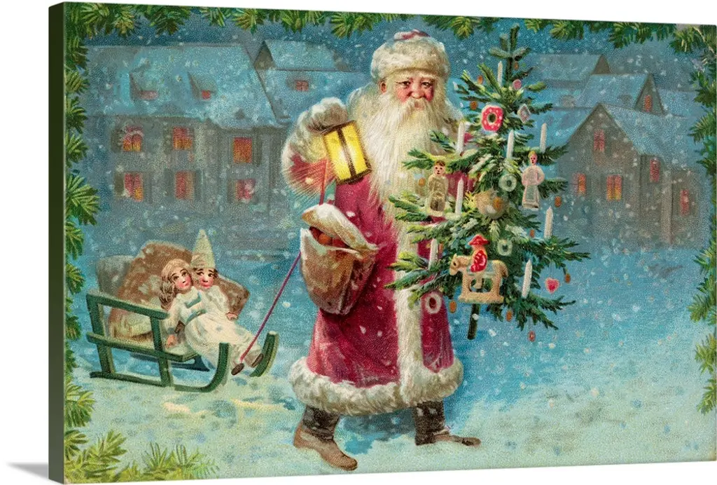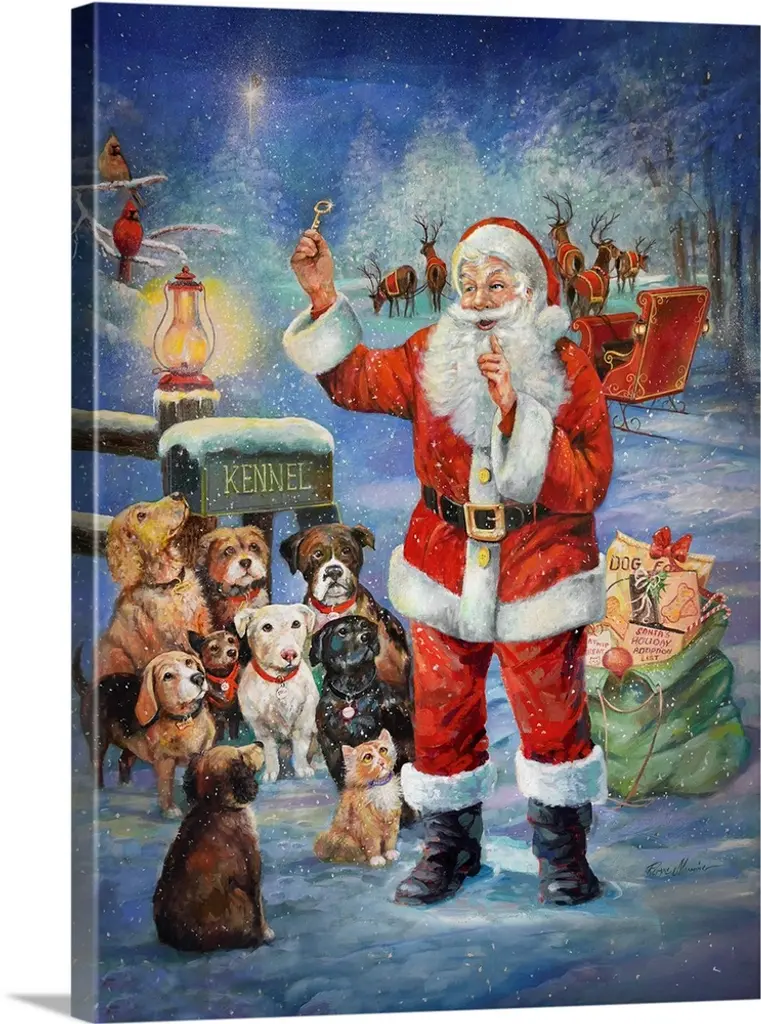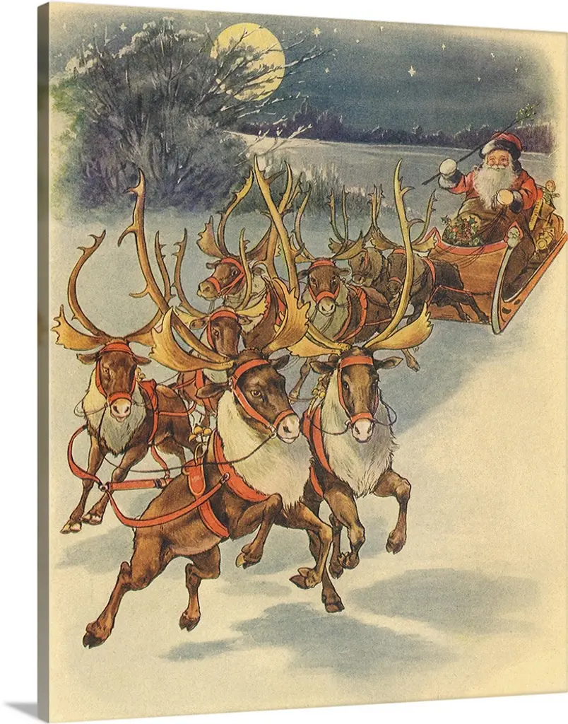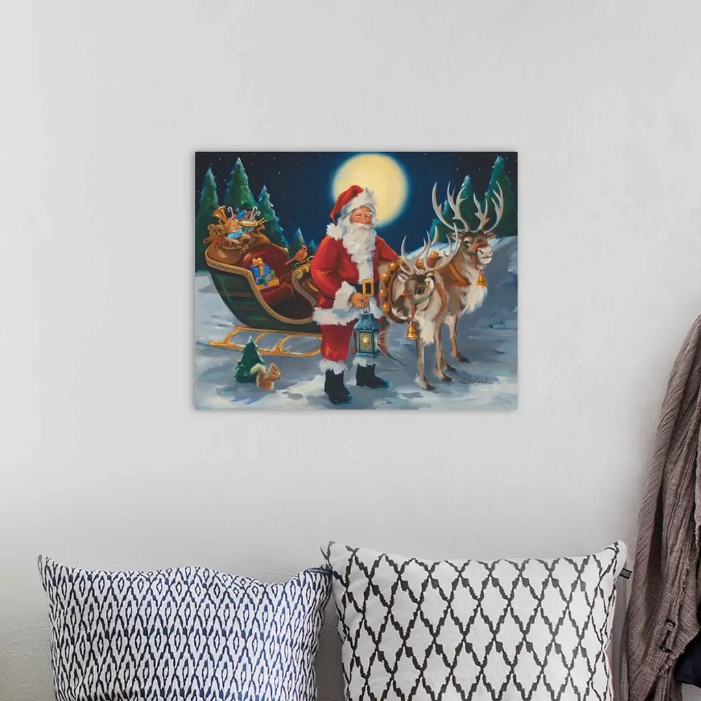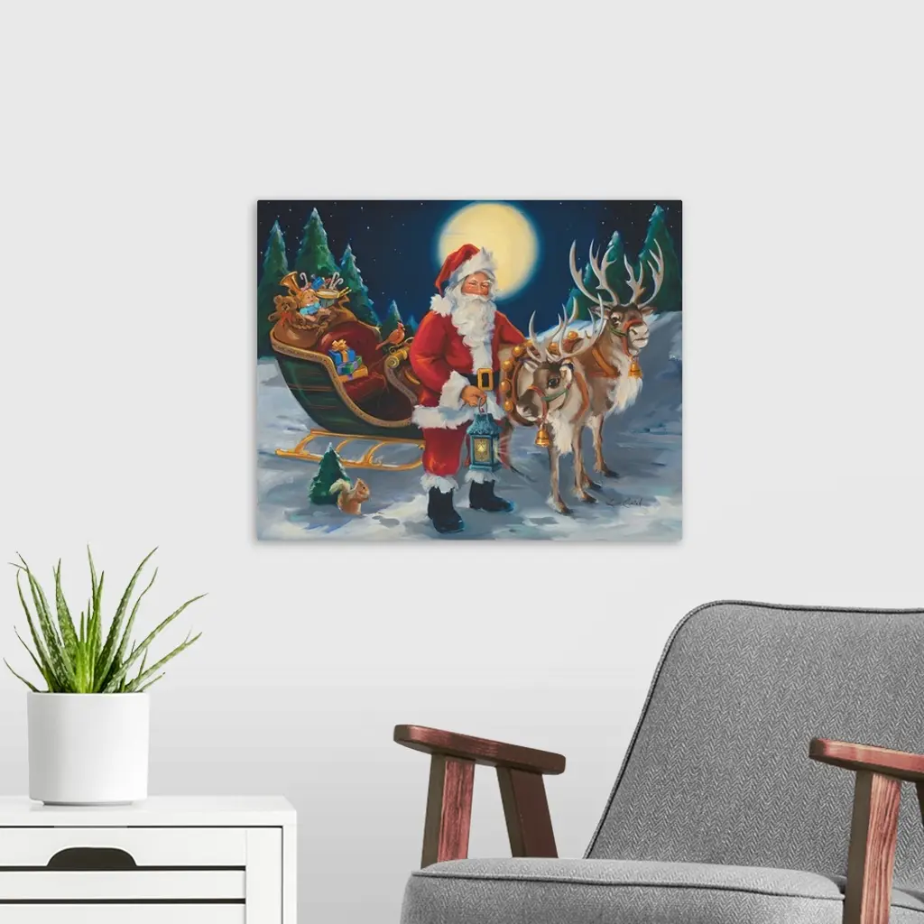 Painting of Santa Claus holding a lantern and standing by his sleigh with reindeer.