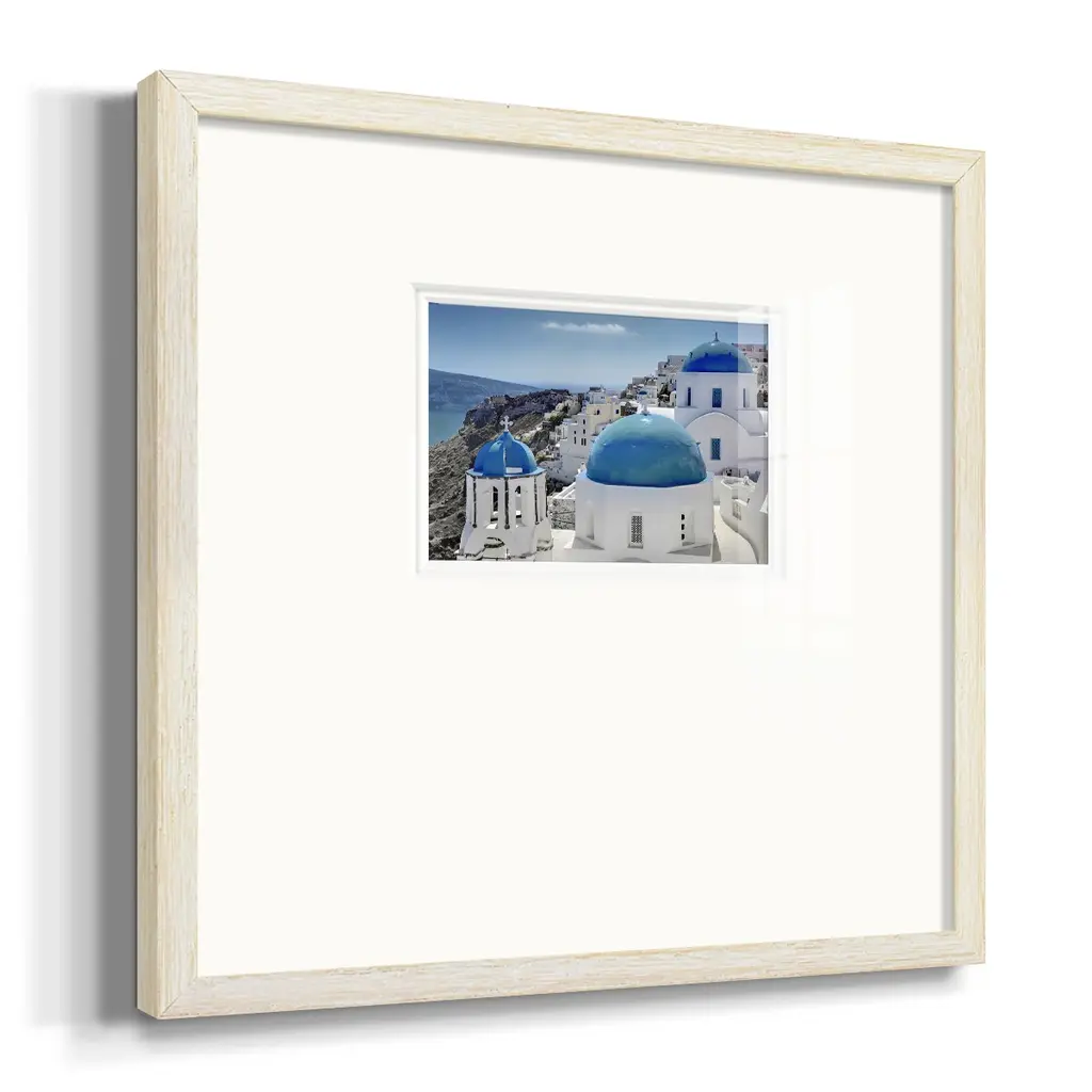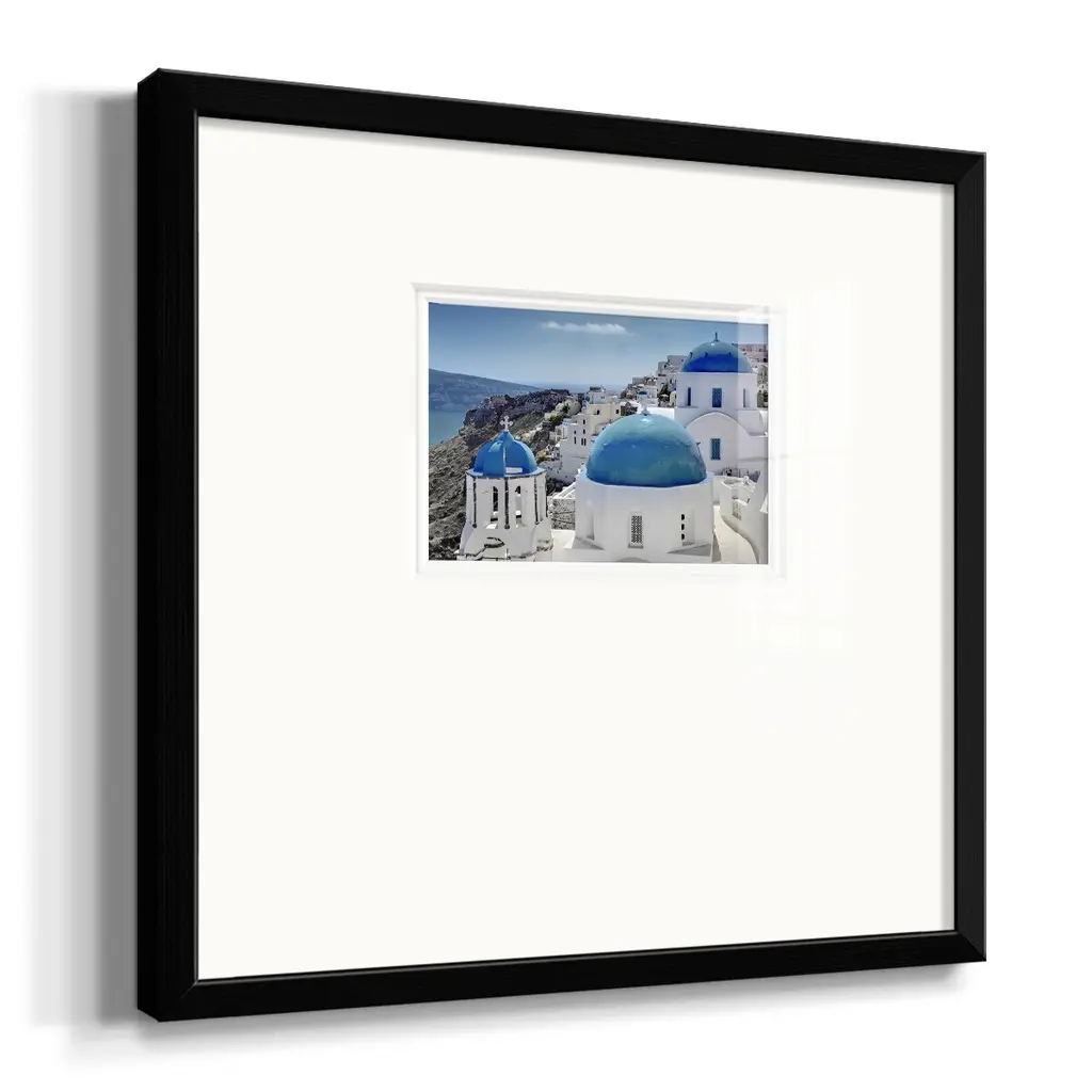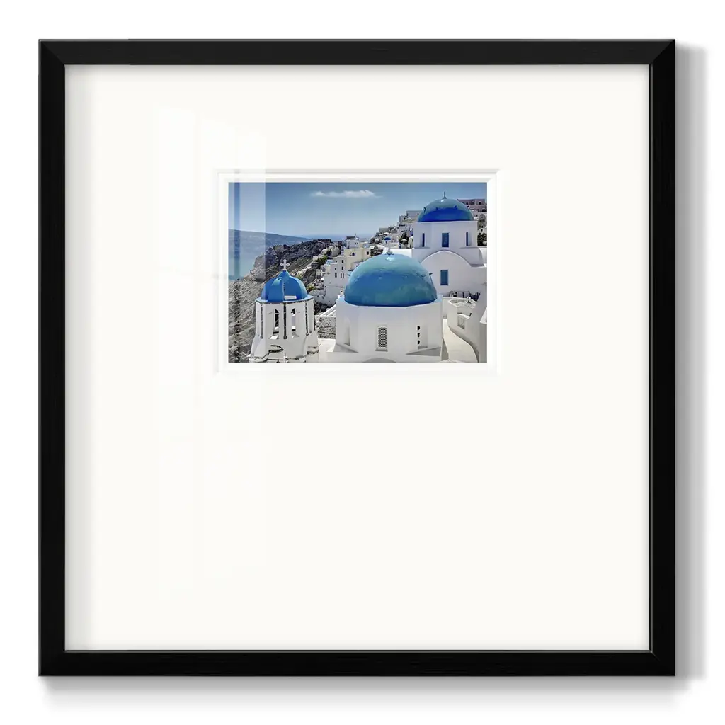Santorini SaturdayPremium Framed Print A framed cold pressed paper print featuring superior double matting and quality frame. 2 SIZES AVAILABLE 16''X16''' - Overall Size 20''X20''' - Overall Size Each piece is made to order. Each piece comes with hanging hardware. Made in the USA Ready to Hang Giclee Paper Print Plexiglass Beveled Matt Board Double Matte Board