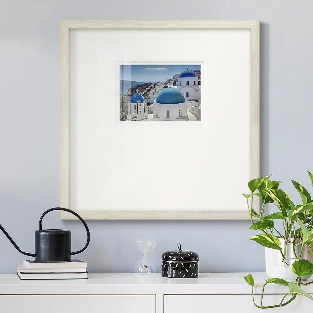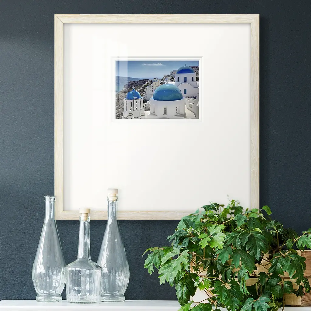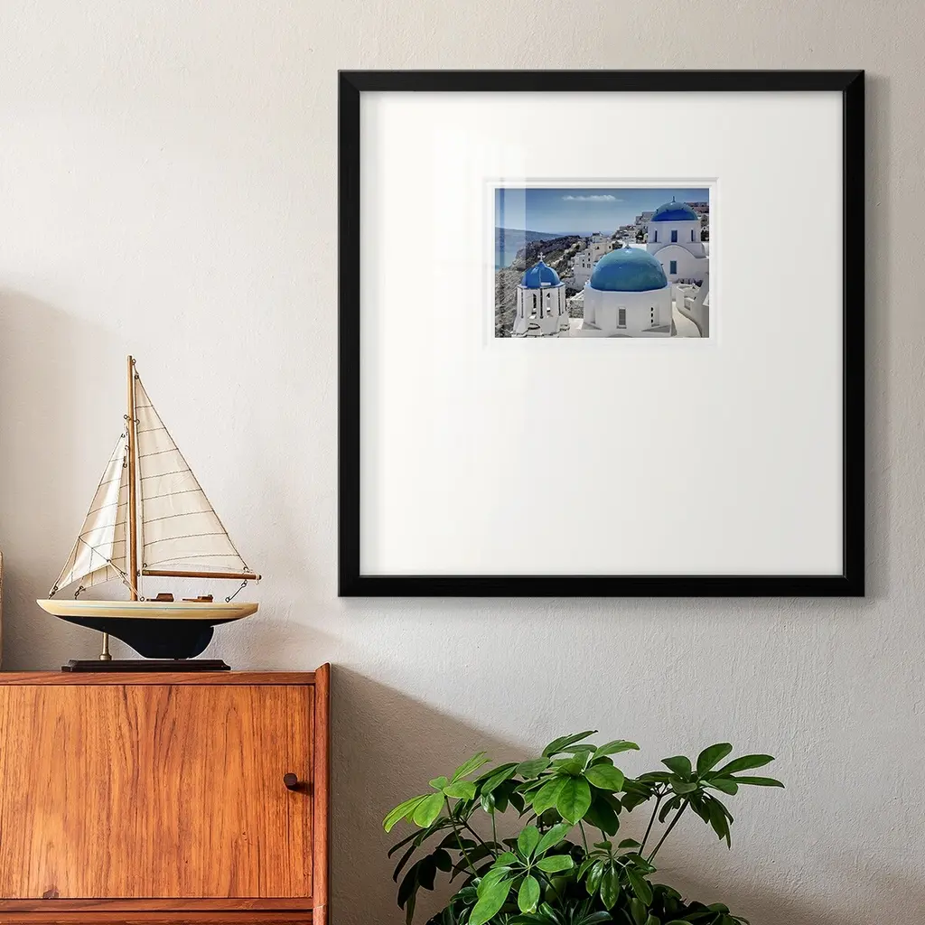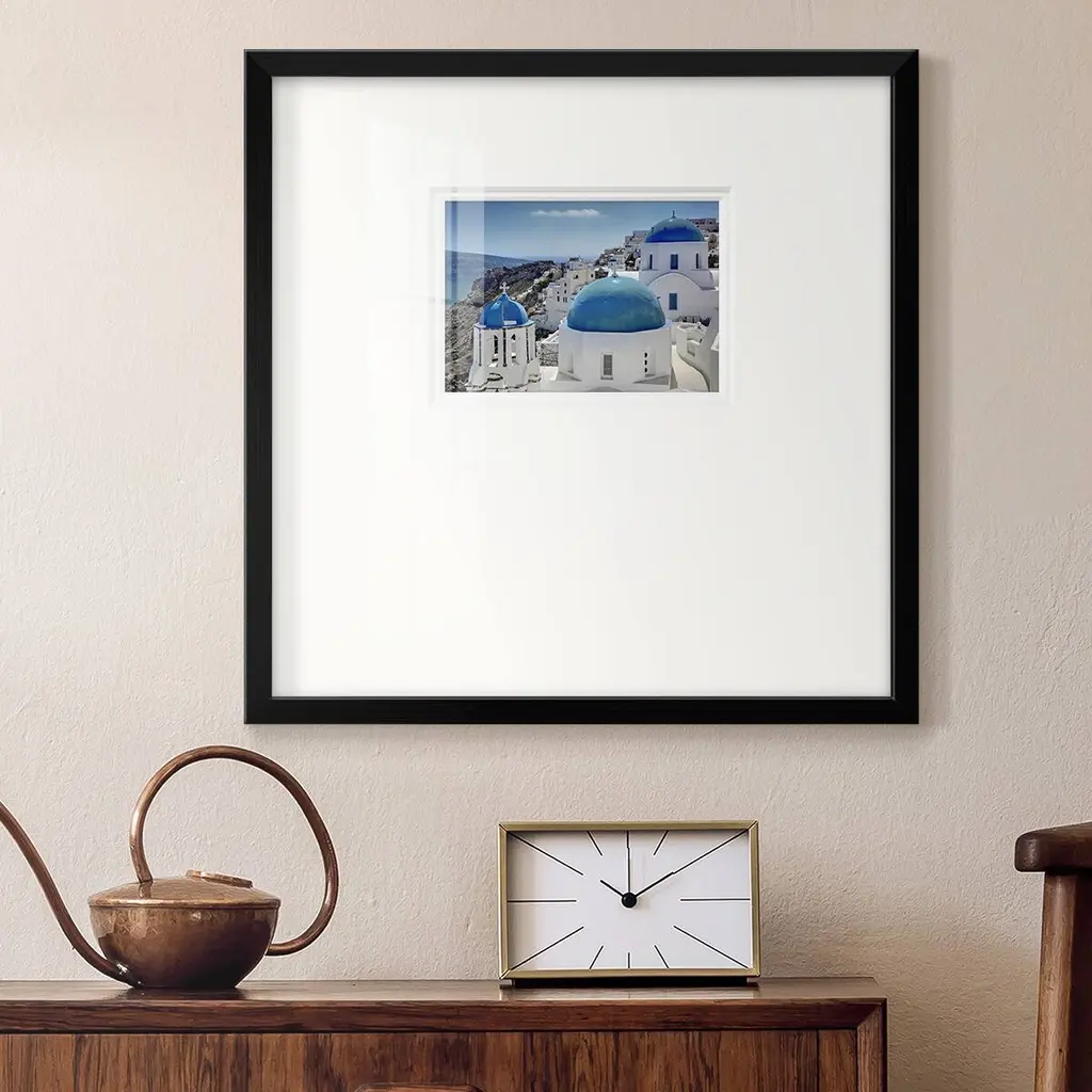 Santorini SaturdayPremium Framed Print A framed cold pressed paper print featuring superior double matting and quality frame. 2 SIZES AVAILABLE 16''X16''' - Overall Size 20''X20''' - Overall Size Each piece is made to order. Each piece comes with hanging hardware. Made in the USA Ready to Hang Giclee Paper Print Plexiglass Beveled Matt Board Double Matte Board
