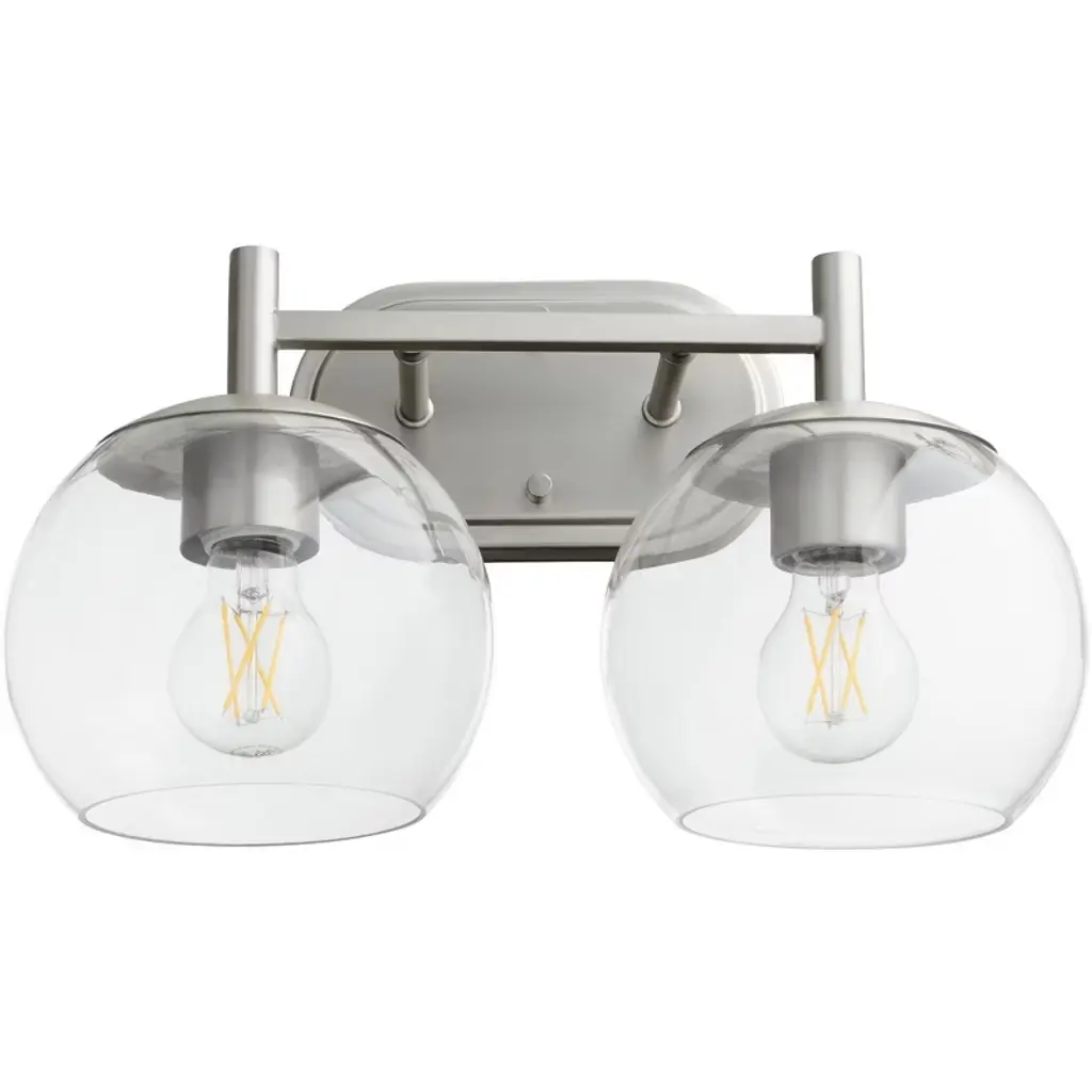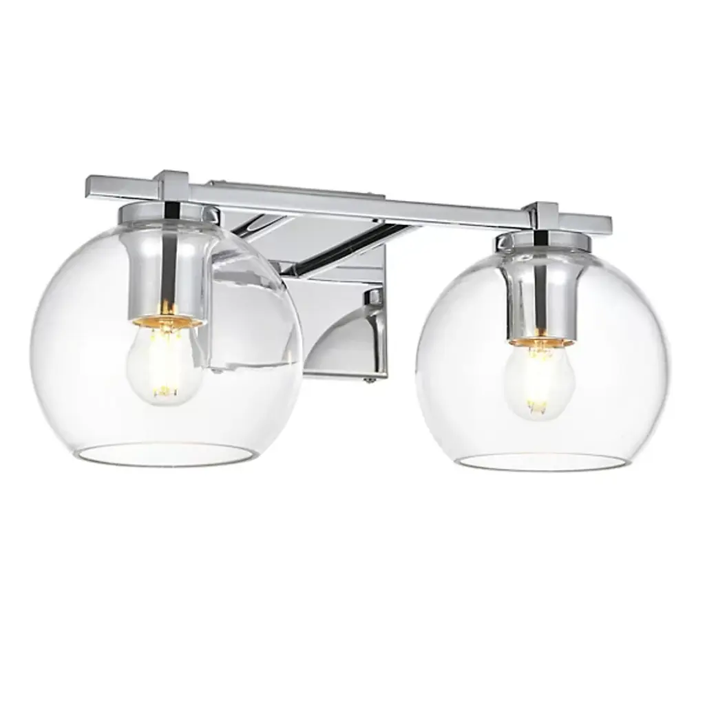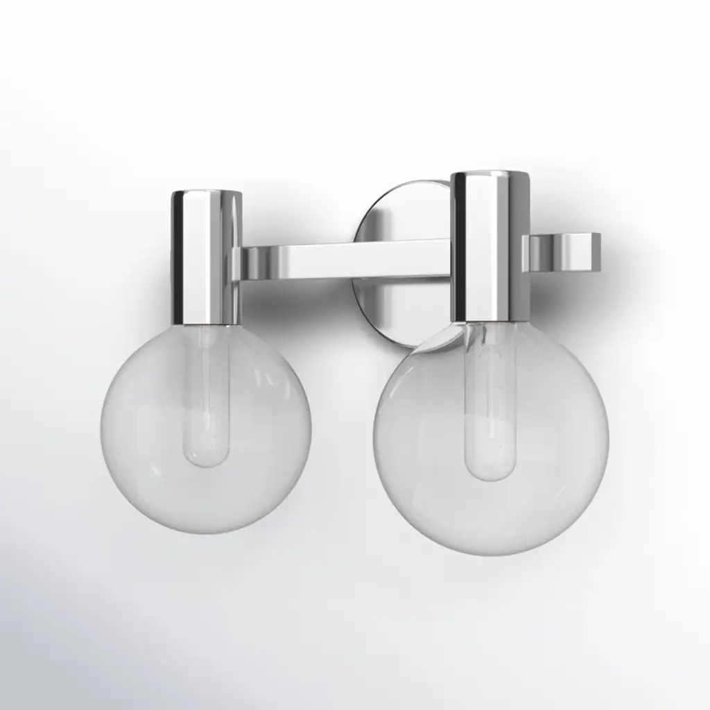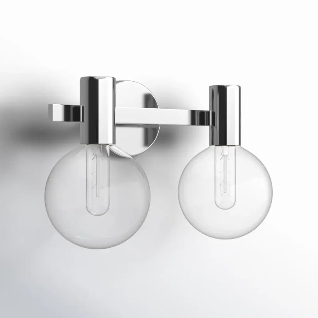 This vanity light is a sleek and stylish addition to any bathroom, featuring a streamlined design that complements any decor. The round clear glass shades not only add an extra dimension to the light fixture but also provide additional protection for the bulbs within. It requires two standard-size bulbs of up to 60 watts per bulb, but the bulbs are not included in the product. We recommend using tubular-shaped bulbs for the best results. The clear glass shades provide ample lighting while diffusing the light and creating a soft, warm glow throughout the bathroom.