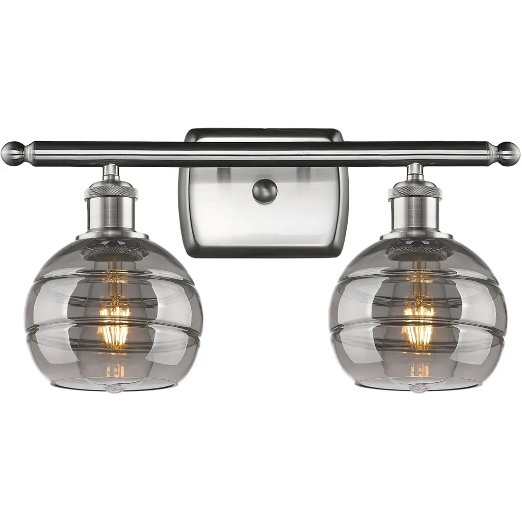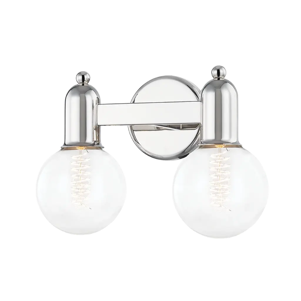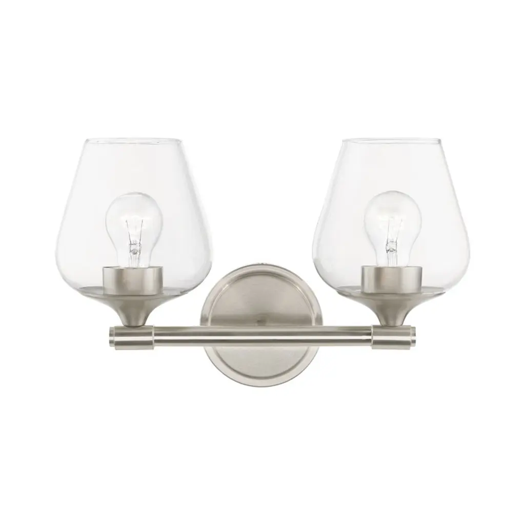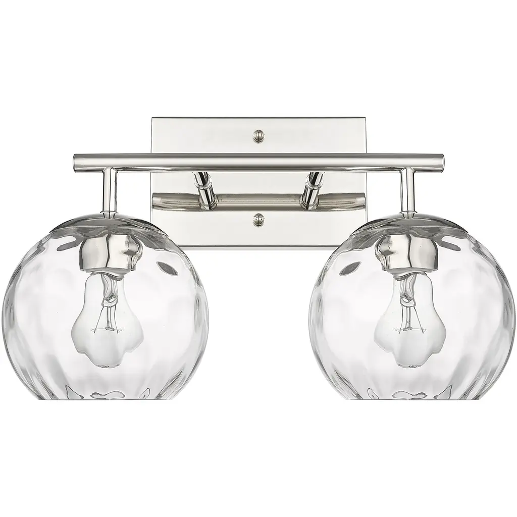 This vanity light is a sleek and stylish addition to any bathroom, featuring a streamlined design that complements any decor. The round clear glass shades not only add an extra dimension to the light fixture but also provide additional protection for the bulbs within. It requires two standard-size bulbs of up to 60 watts per bulb, but the bulbs are not included in the product. We recommend using tubular-shaped bulbs for the best results. The clear glass shades provide ample lighting while diffusing the light and creating a soft, warm glow throughout the bathroom.