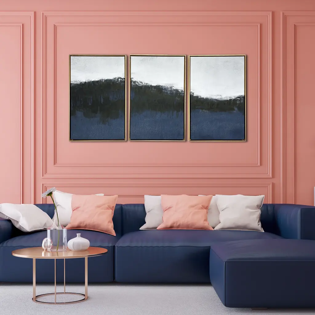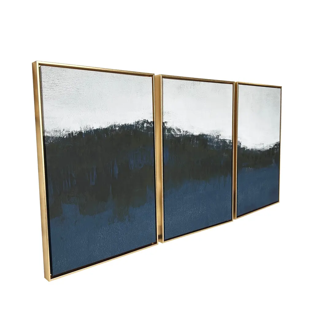 Elevate your space with "Sapphire Abstract" triptych wall art. This captivating piece features a modern blend of blue, black, and white hues, printed on a canvas surrounded by a gold floating frame. Measuring 24x48 inches overall, it makes a bold statement in any room. Ideal for living rooms, offices, or bedrooms, "Sapphire Abstract" seamlessly complements both minimalist and eclectic interiors. This bold piece will add a touch of sophistication and style to your home interiors.