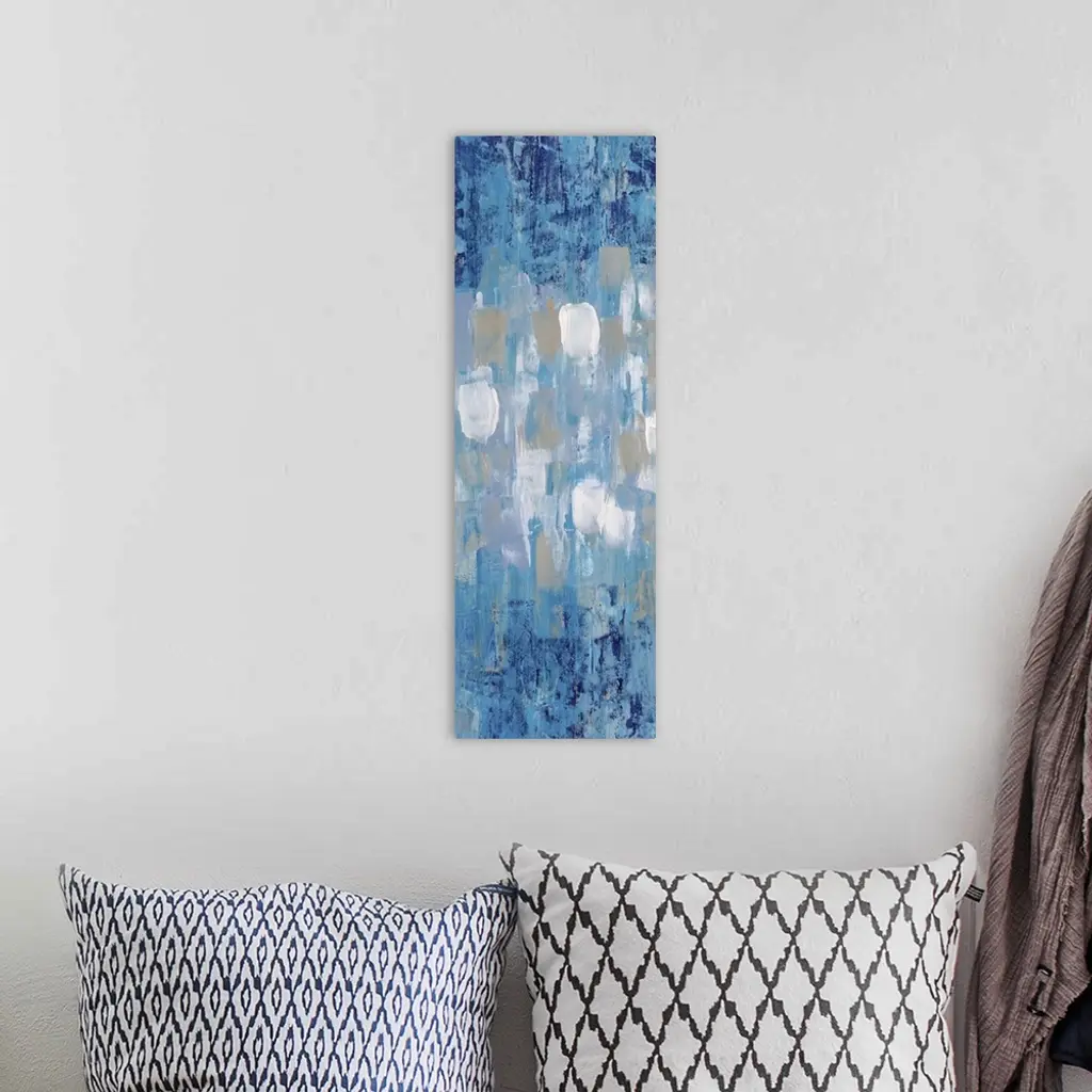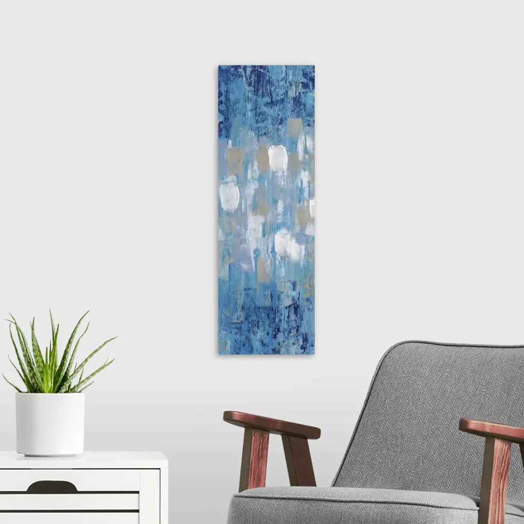 Contemporary abstract painting in blue with white and grey shapes in the center.