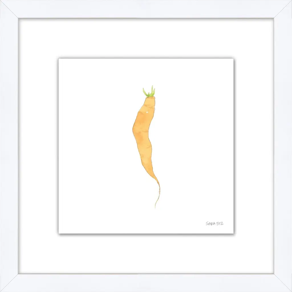This print of a painterly carrot is ideal for adding color and charm to a kitchen, breakfast room, or den. Floated on a white mat within a wood frame, it arrives ready to hang.