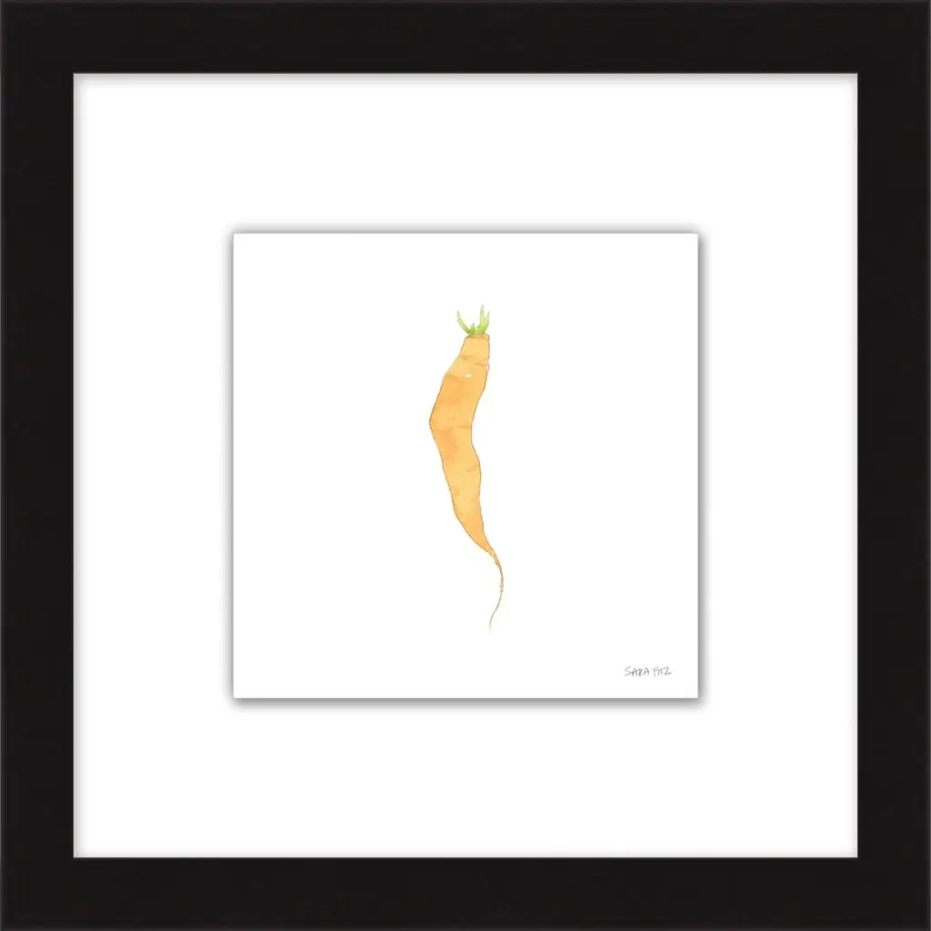 This print of a painterly carrot is ideal for adding color and charm to a kitchen, breakfast room, or den. Floated on a white mat within a wood frame, it arrives ready to hang.
