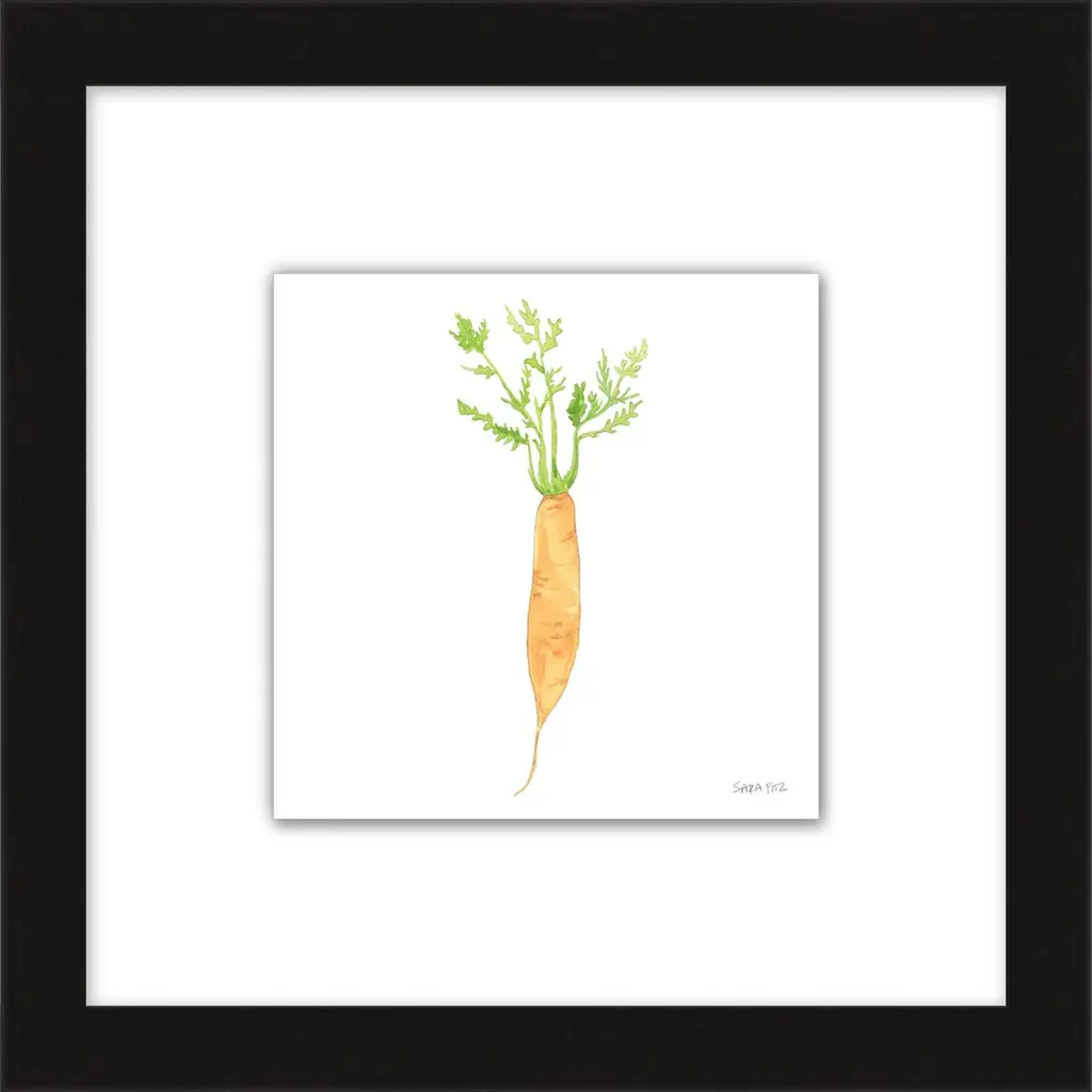 This print of a painterly carrot is ideal for adding color and charm to a kitchen, breakfast room, or den. Floated on a white mat within a wood frame, it arrives ready to hang.