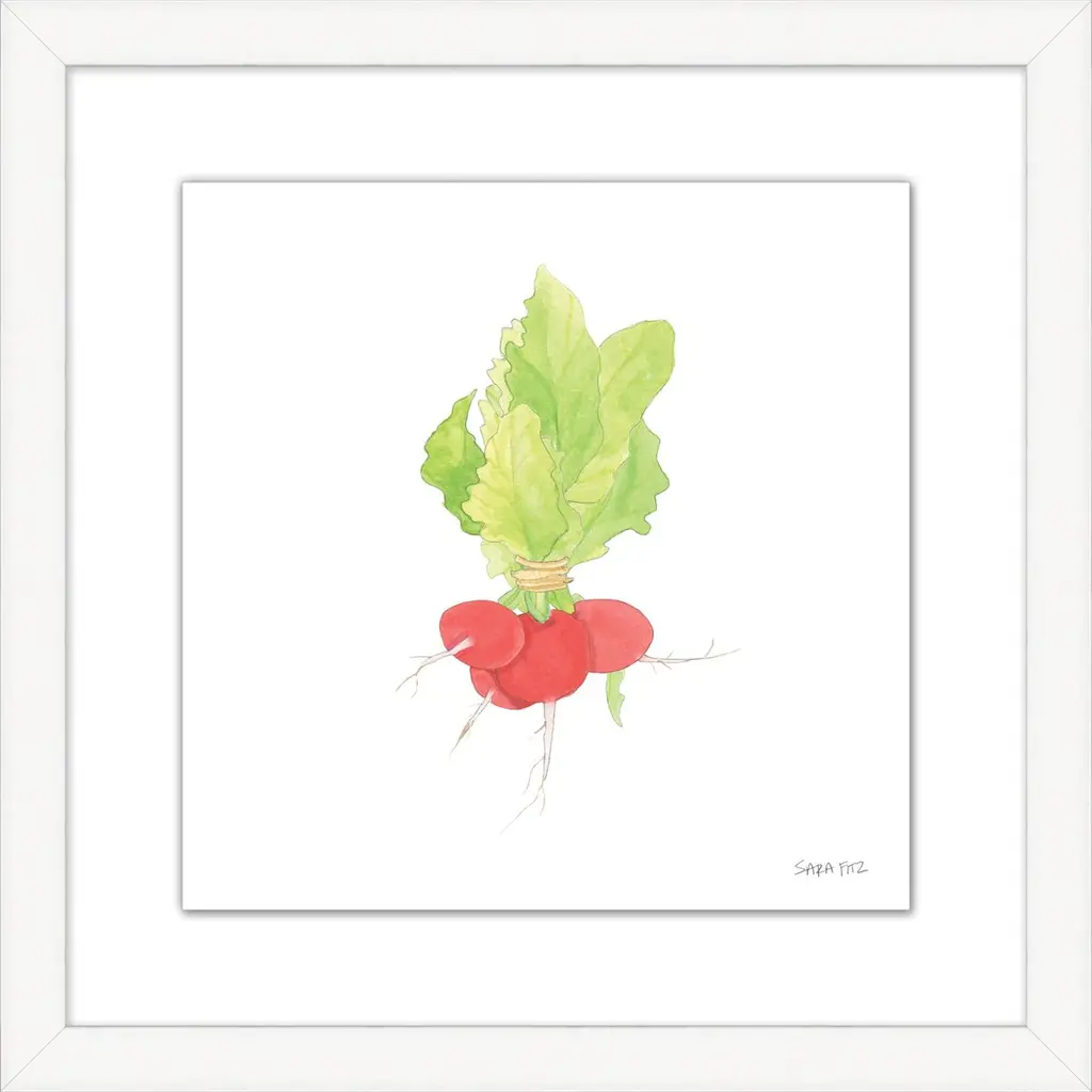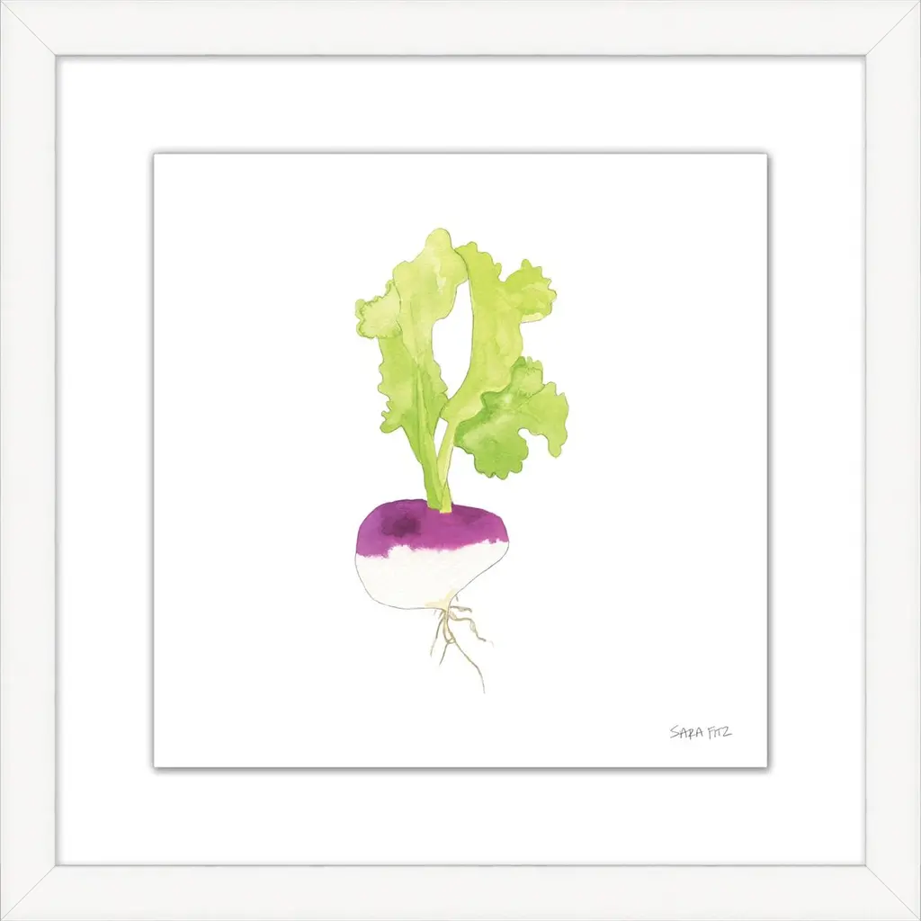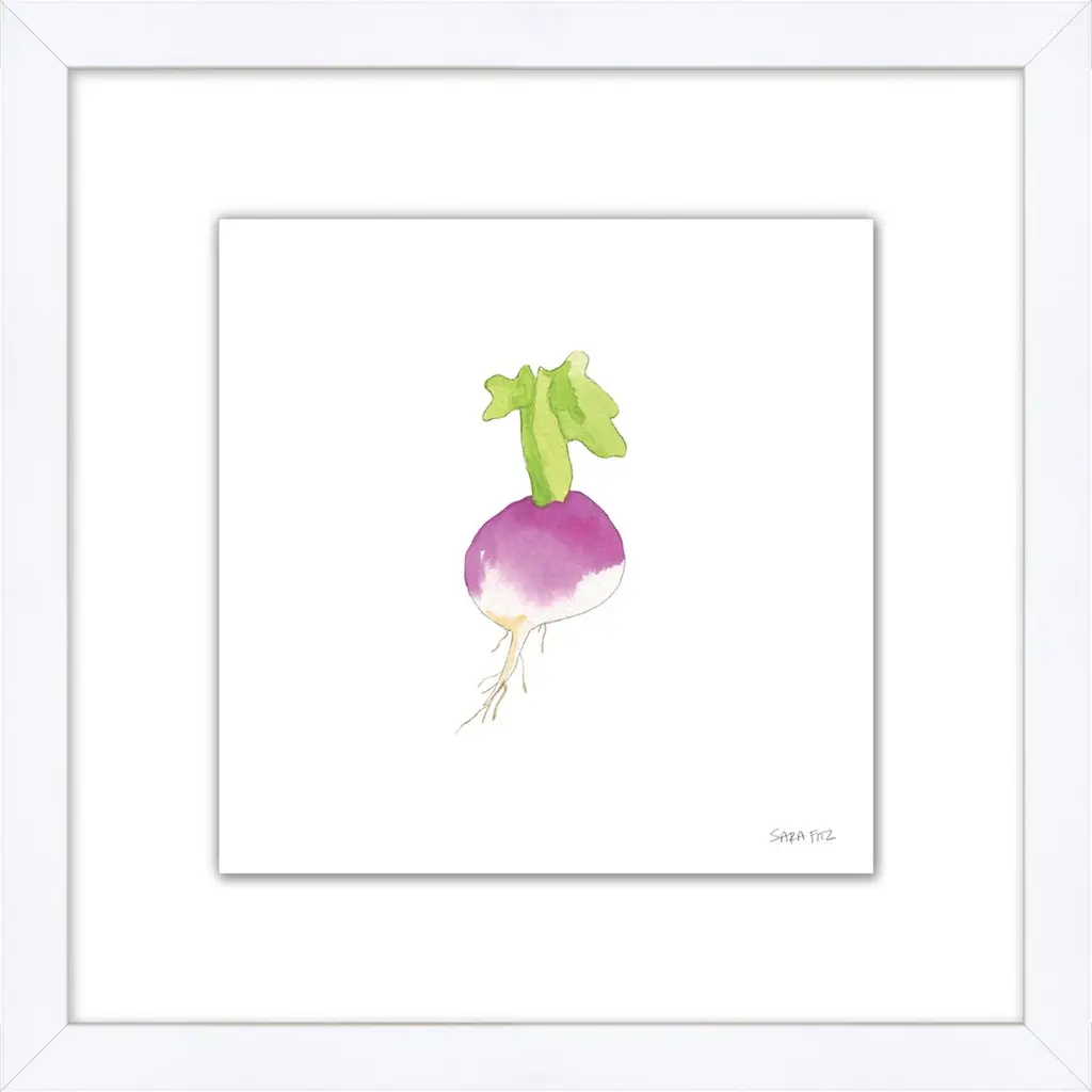 This giclée print of a painterly daikon is certain to brighten up a kitchen, breakfast room, or den. Floated on a white mat within a wood frame, it arrives ready to hang.