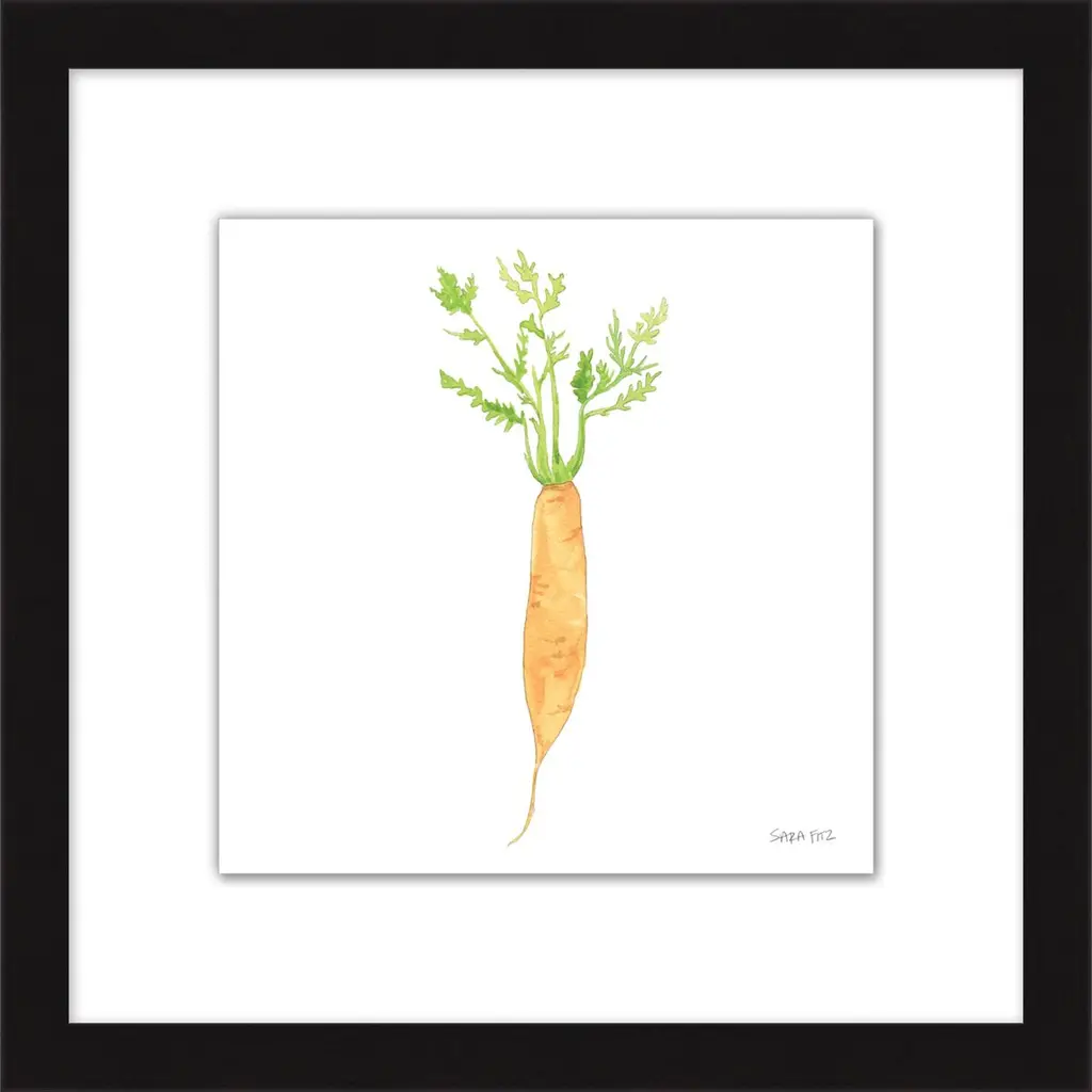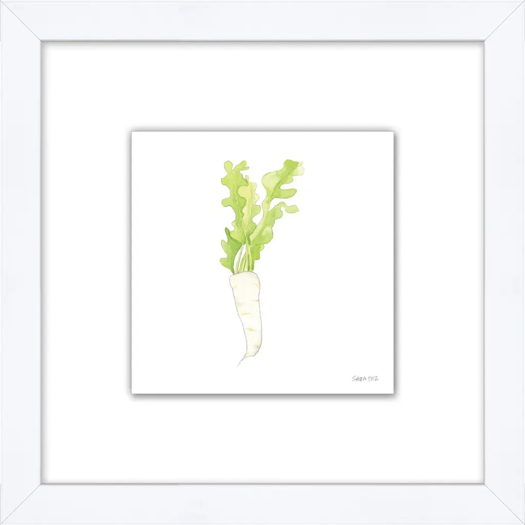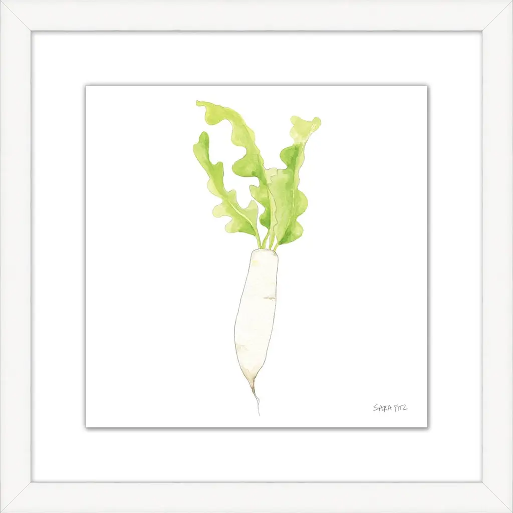 This giclée print of a painterly daikon is certain to brighten up a kitchen, breakfast room, or den. Floated on a white mat within a wood frame, it arrives ready to hang.
