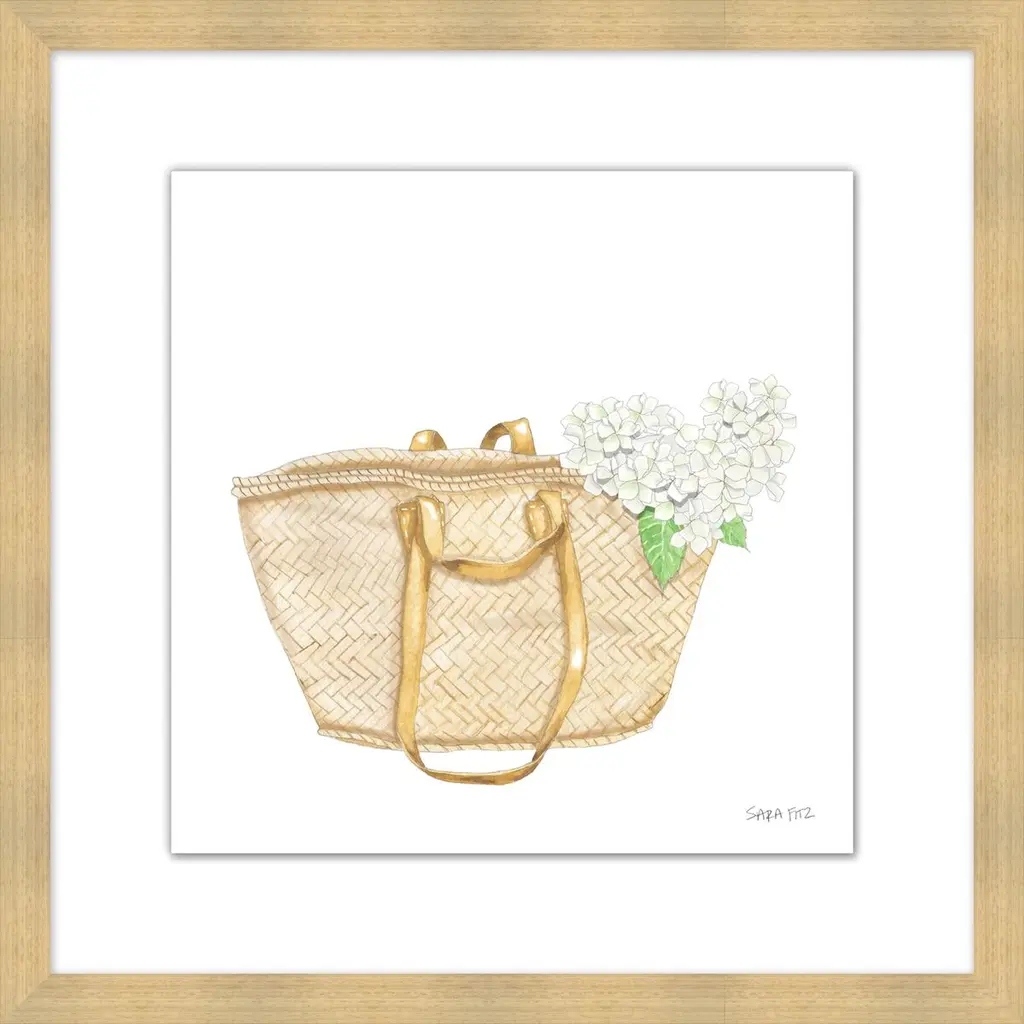 With her watercolor painting of flowers in a striped tote bag, Sara Fitz captures the delight of market day. This giclée print of the painting is floated on a white mat within a wood frame and arrives ready to hang.
