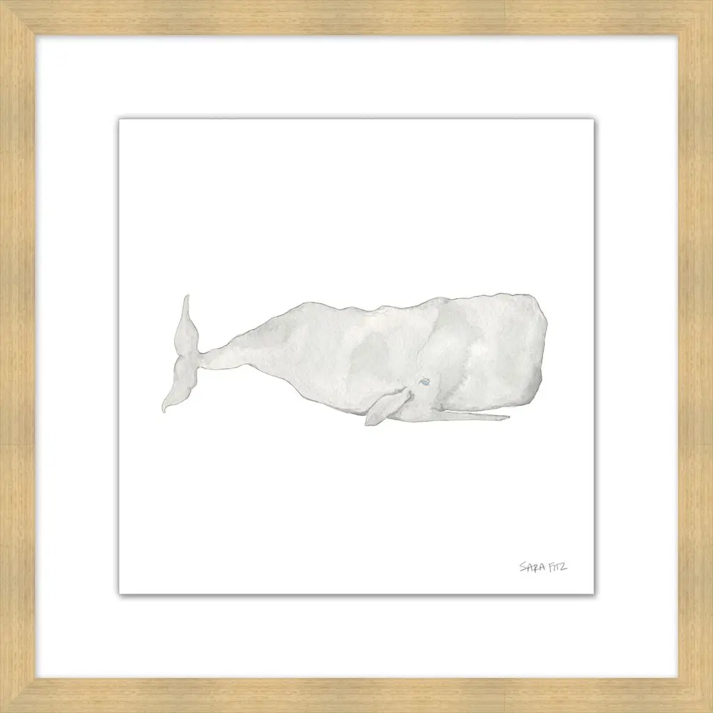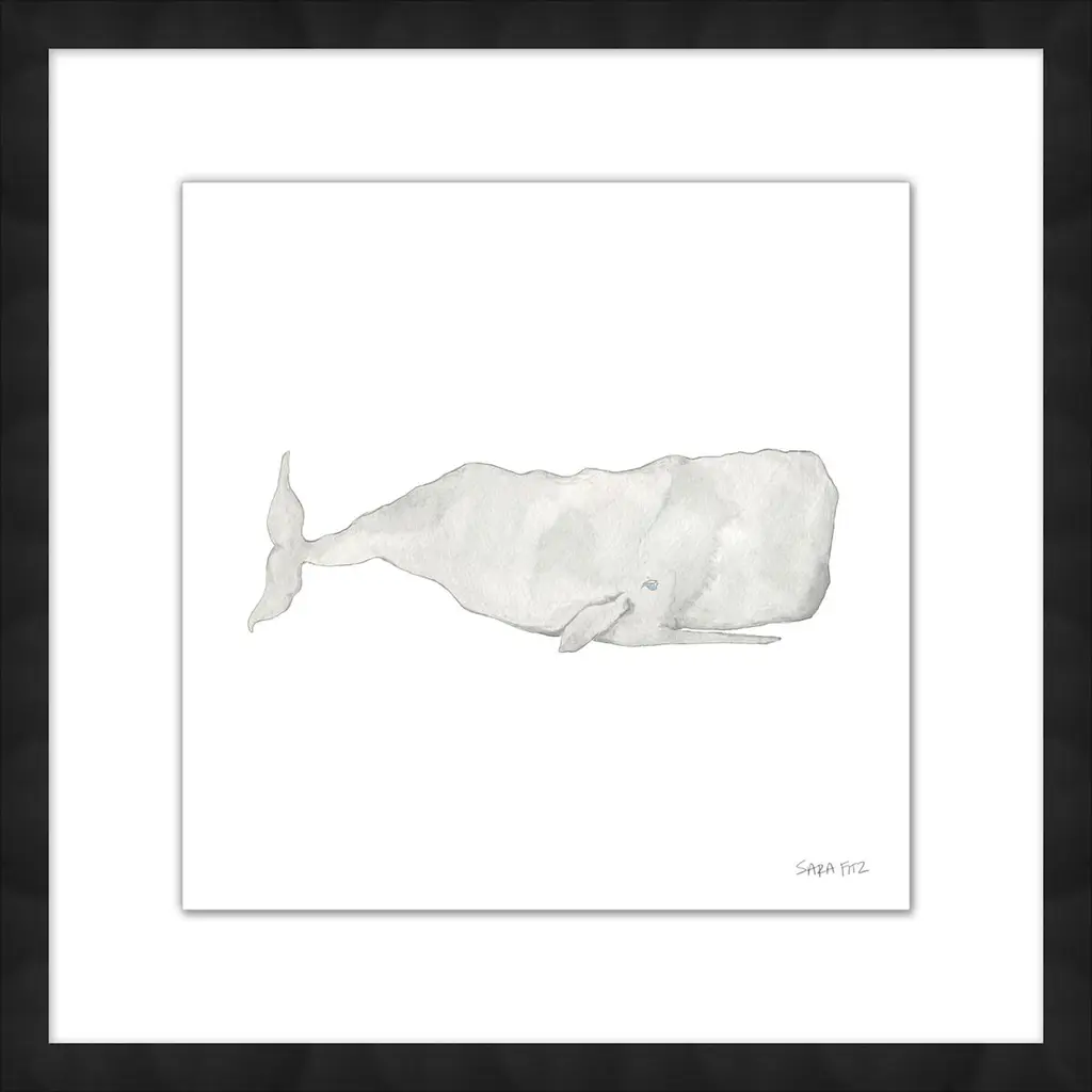 Sara Fitz's watercolor painting of a gray whale will delight animal-lovers and seaside aficionados alike. This giclée print of the watercolor is floated on a white mat within a wood frame and arrives ready to hang.