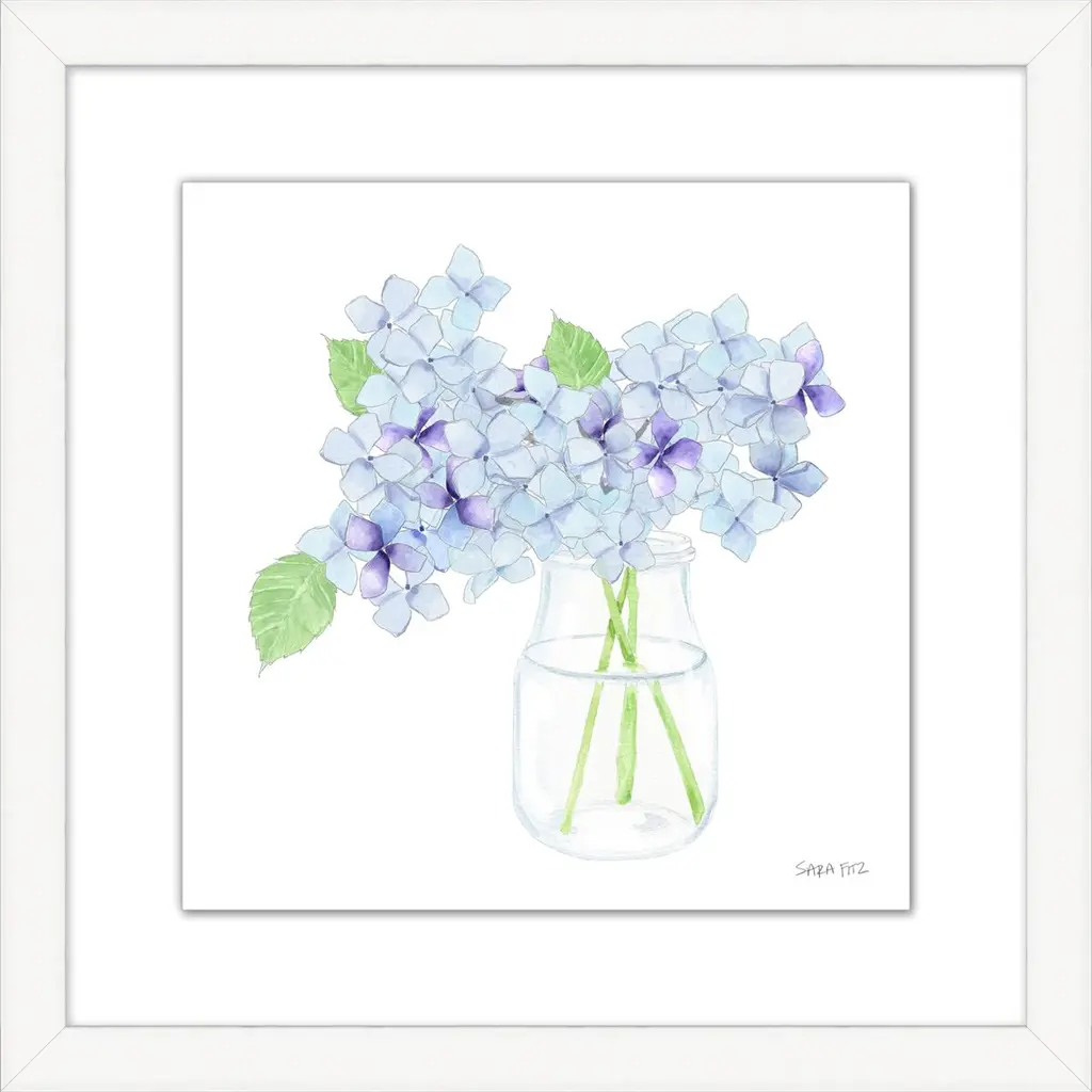 Relish the joys of spring year-round courtesy of Sara Fitz's delicate depiction of periwinkle hydrangeas in a vase. Floated on a white mat within a wood frame, the giclée print arrives ready to hang.