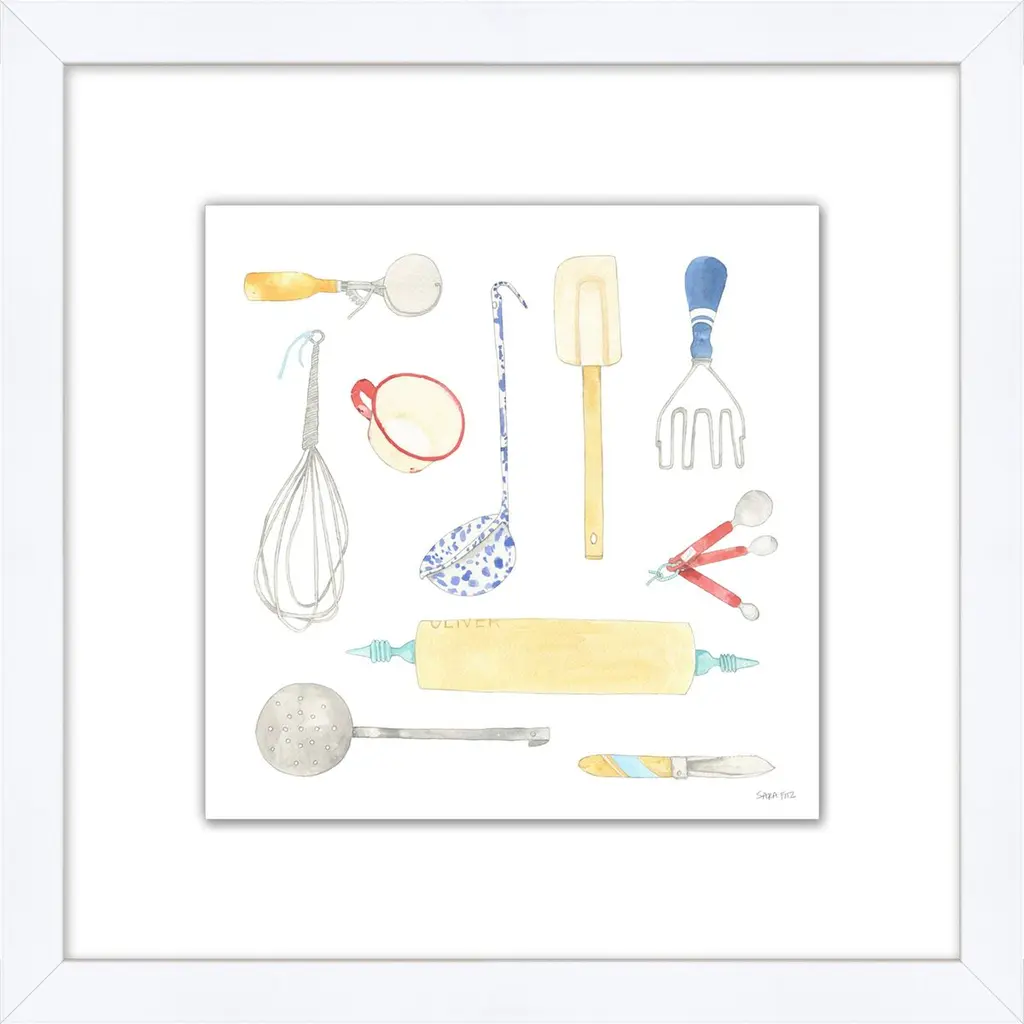 Sara Fitz's painterly depiction of cooking tools will brighten up your kitchen, breakfast nook, or any other space. Floated on a white mat within a wood frame, this giclée print arrives ready to hang.
