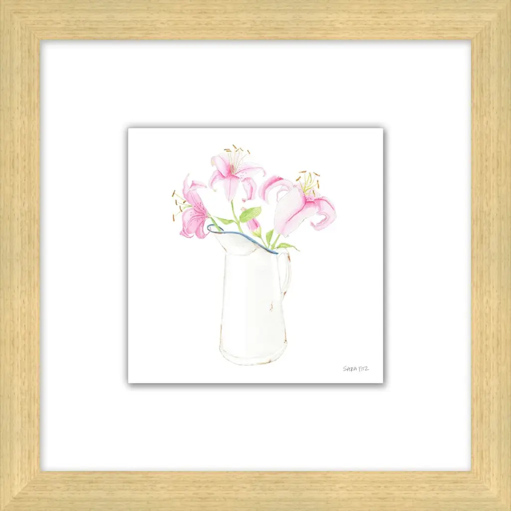 Relish the joys of spring year-round courtesy of Sara Fitz's graceful depiction of lilies in a pitcher. Floated on a white mat within a wood frame, the giclée print arrives ready to hang.