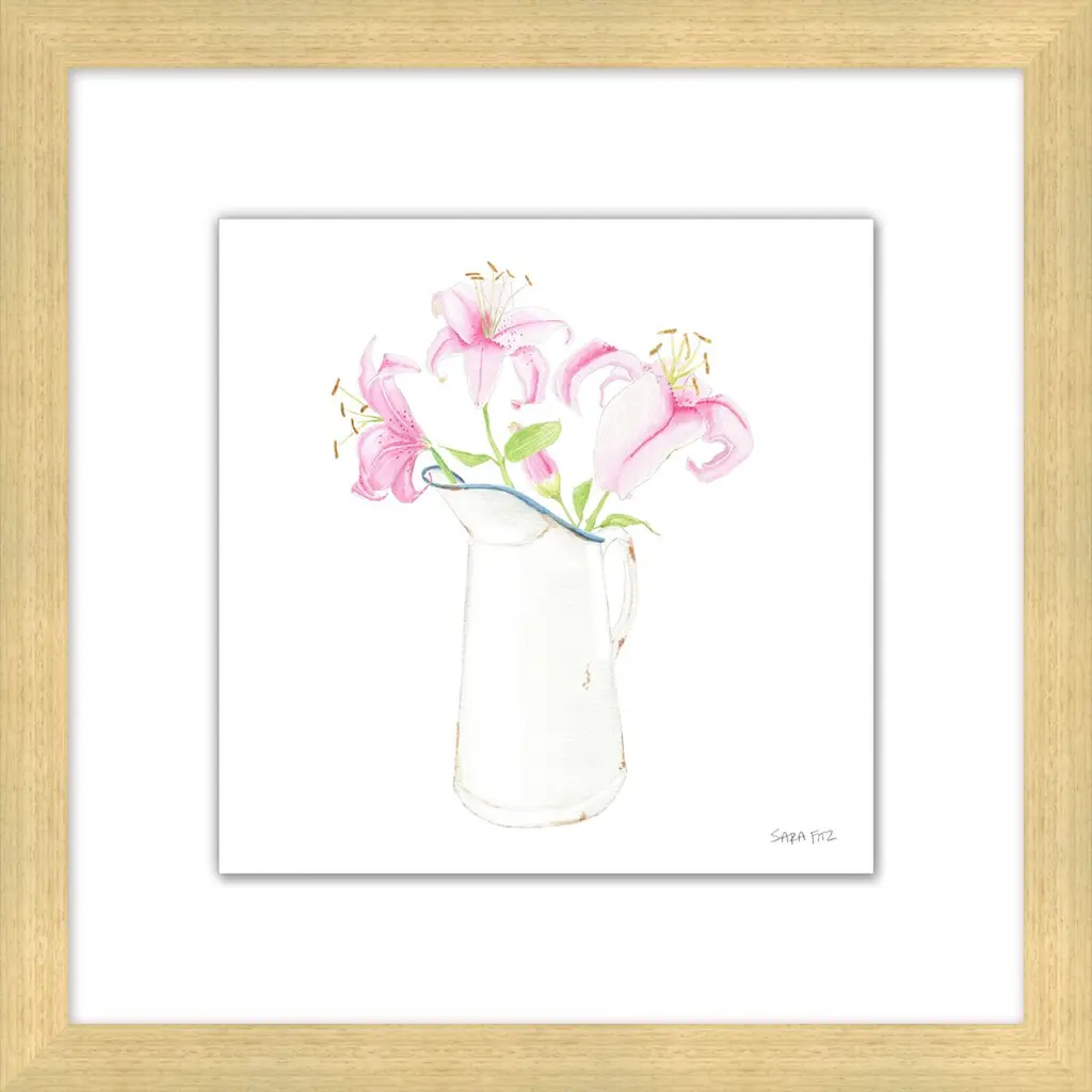 Relish the joys of spring year-round courtesy of Sara Fitz's graceful depiction of lilies in a pitcher. Floated on a white mat within a wood frame, the giclée print arrives ready to hang.