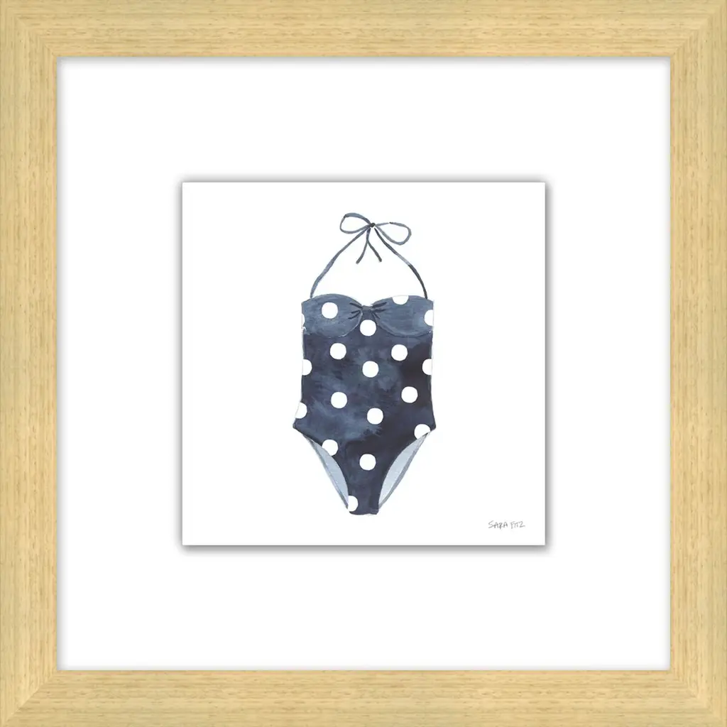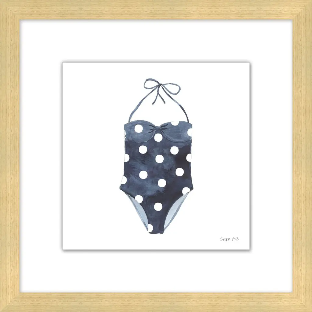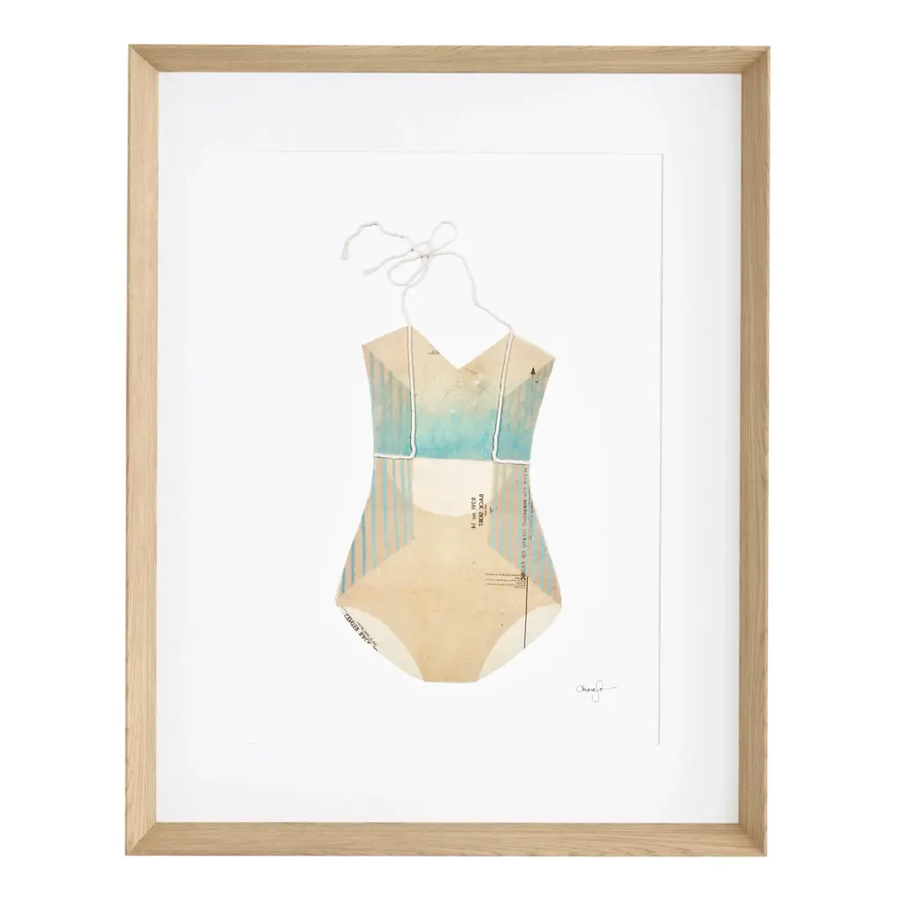 Sara Fitz's watercolor painting of a vintage swimsuit evokes the simple pleasures of summer by the coast. This giclée print of the painting is floated on a white mat within a wood frame and arrives ready to hang.