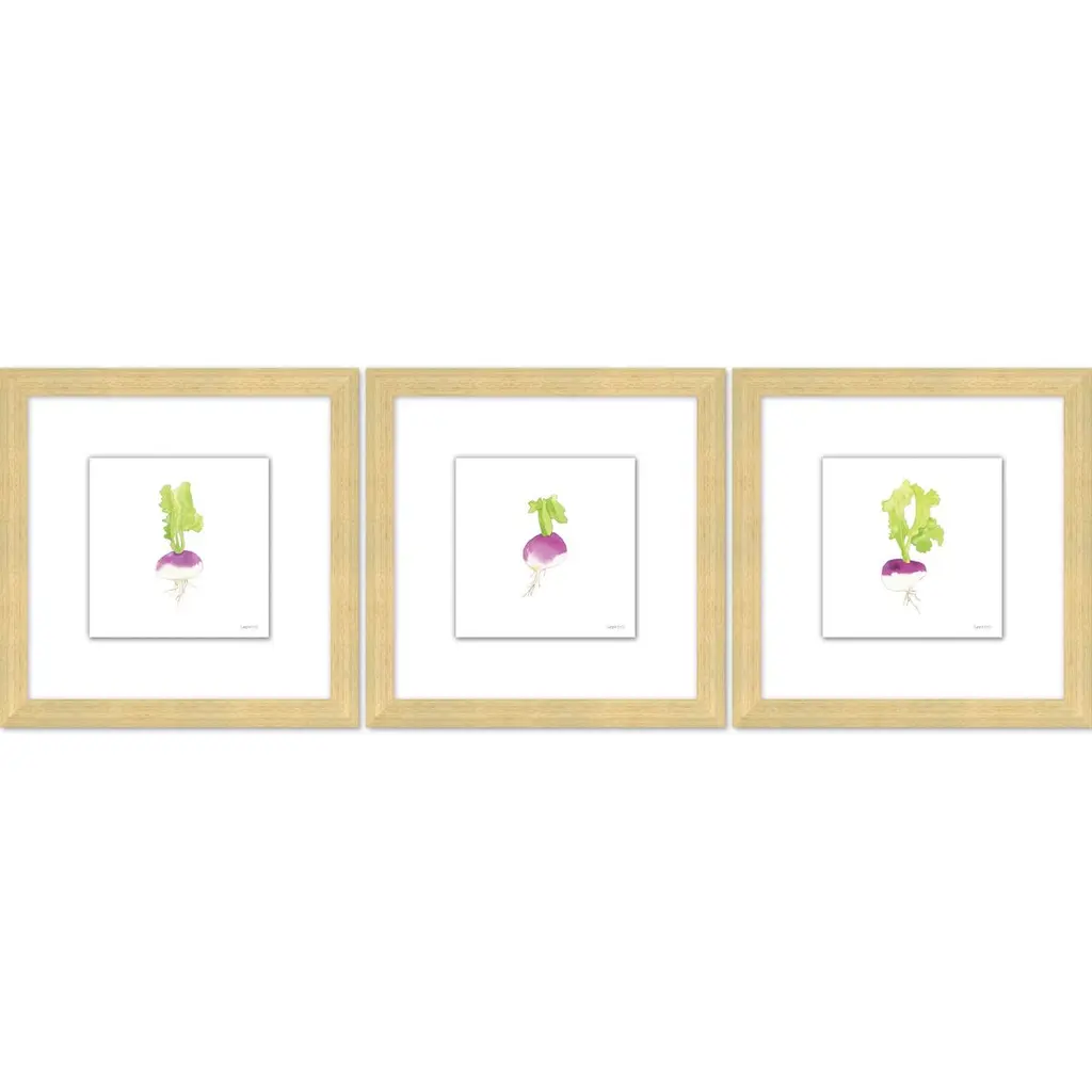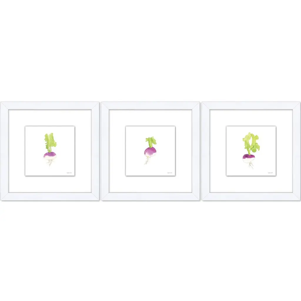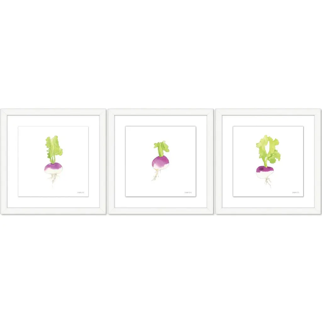 This trio of gicl��e prints will have you seeing the humble turnip in a new light. Each print is floated on a white mat within a wood frame and arrives ready to hang.