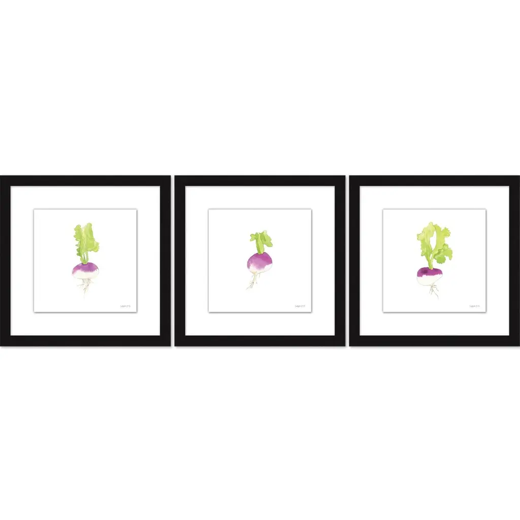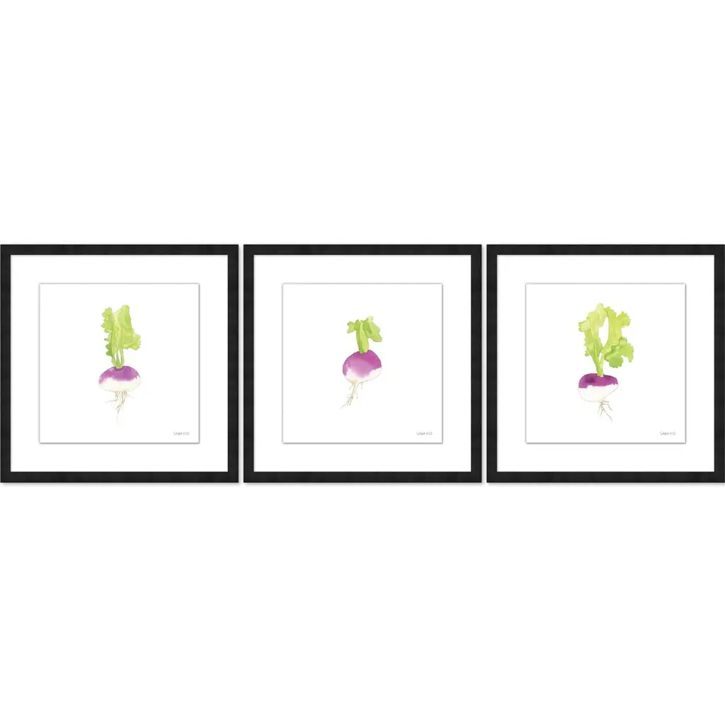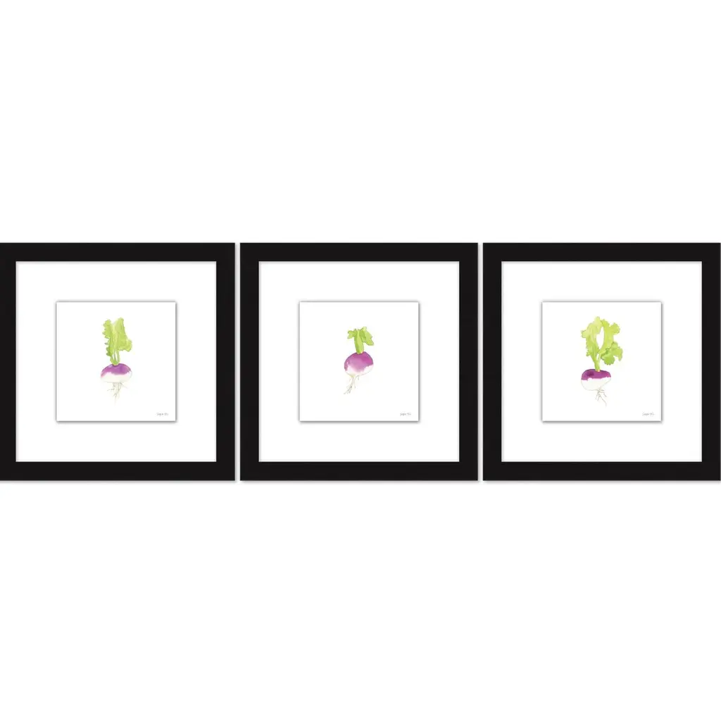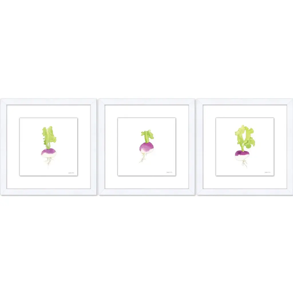 This trio of gicl��e prints will have you seeing the humble turnip in a new light. Each print is floated on a white mat within a wood frame and arrives ready to hang.