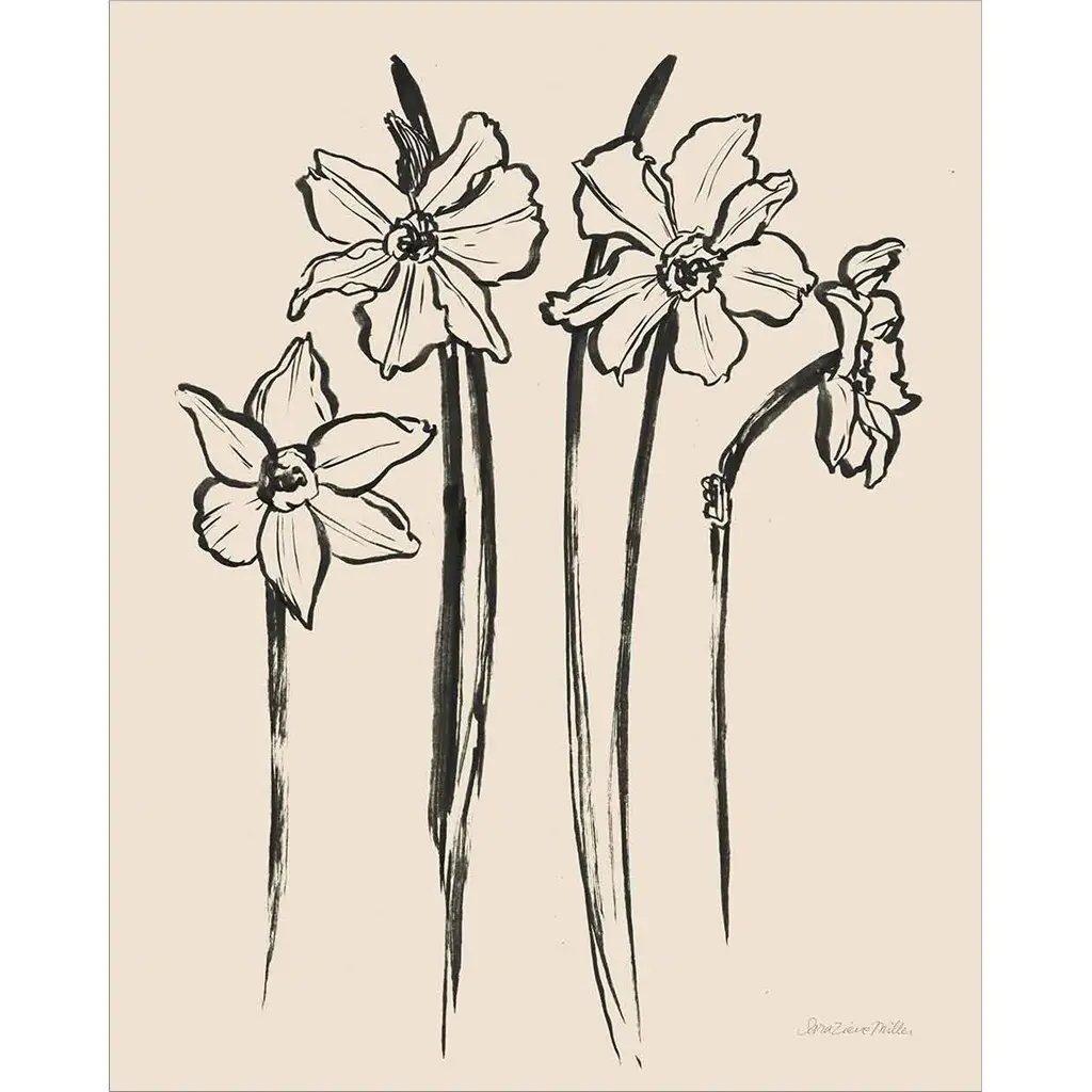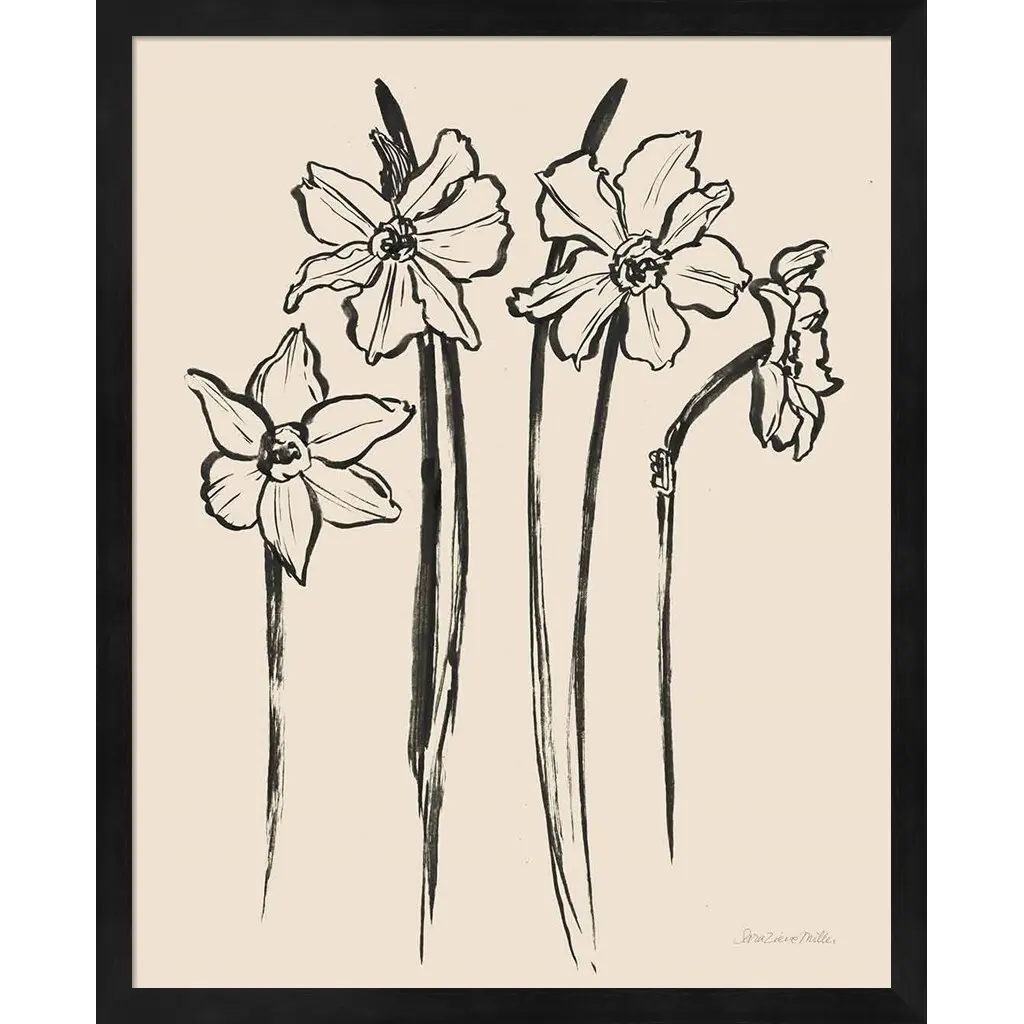 Ink Sketch Daffodils by Sara Zieve Miller is a high quality piece of framed artwork. The finished size of this piece is 17.25" X 21.25". It has a Black Deep Box frame and is finished with high quality glass. 100% Satisfaction Guaranteed.