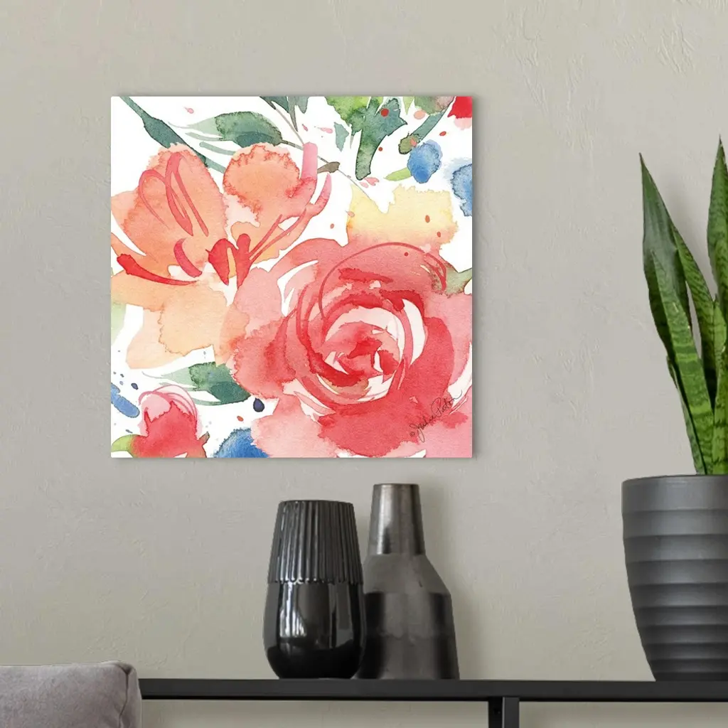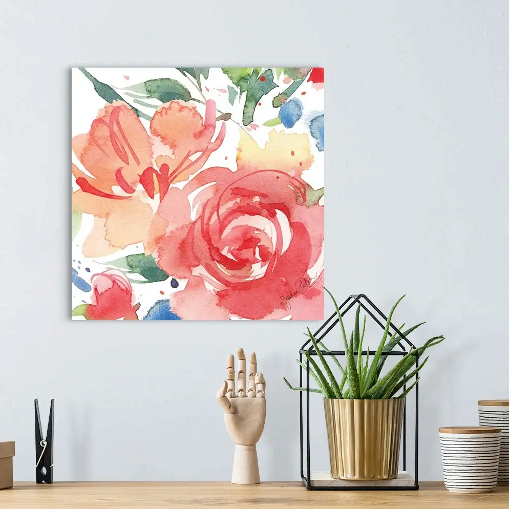 Square watercolor painting of roses with green and blue leaves on a white background.