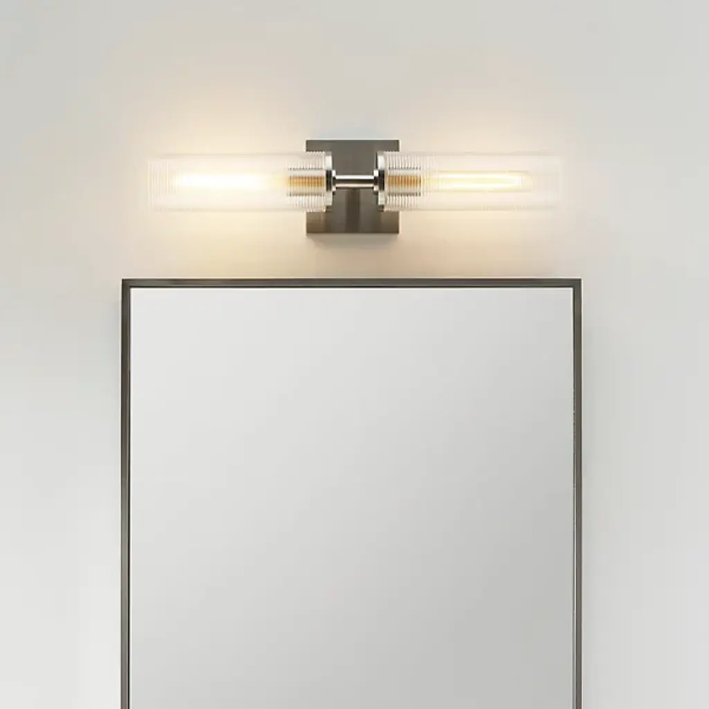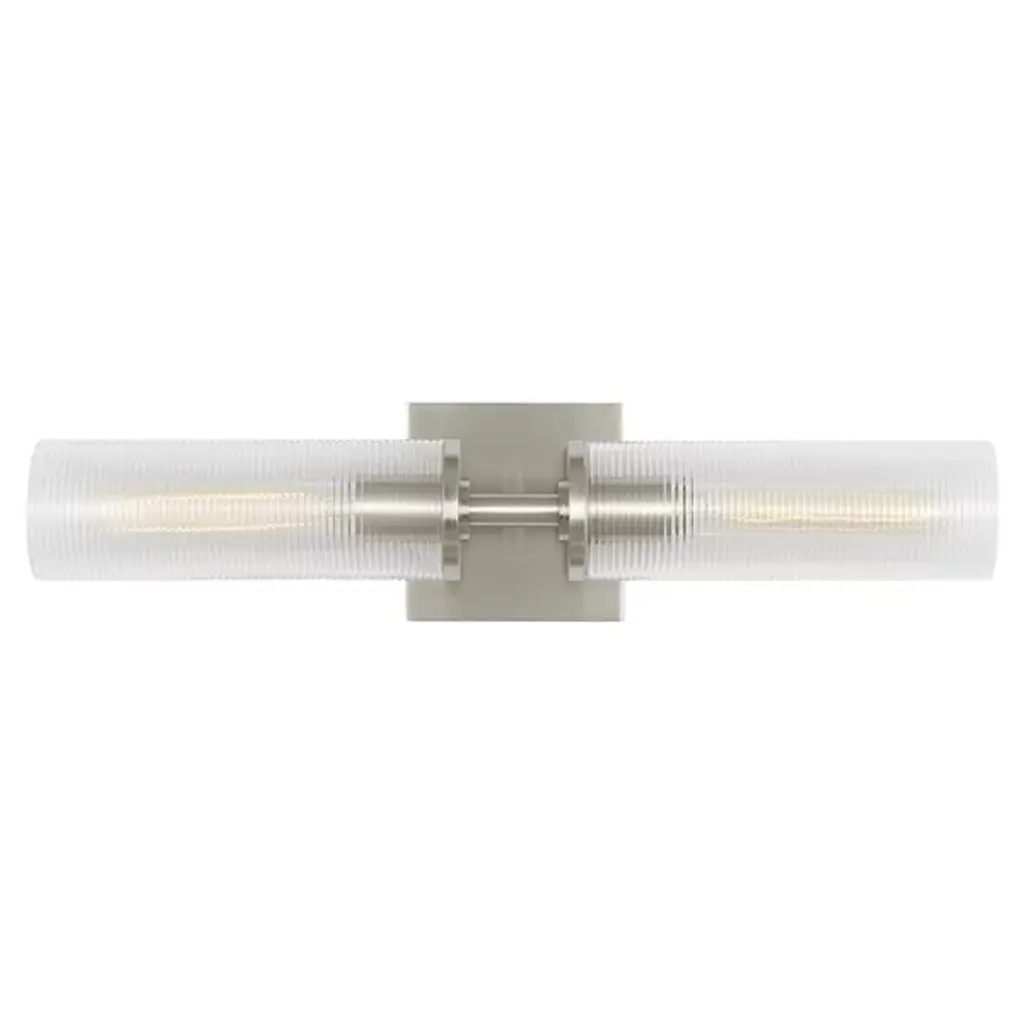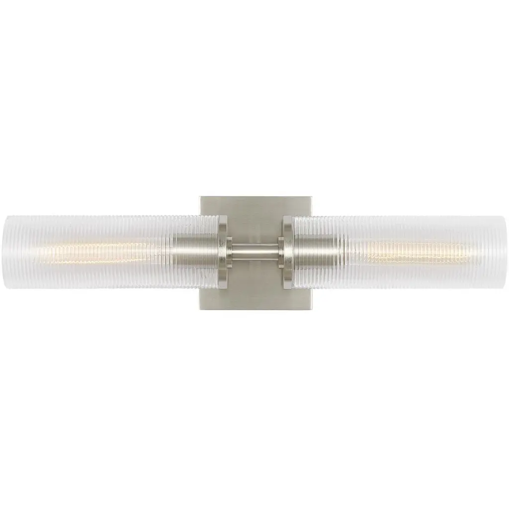 The Sarita Vanity Light from Visual Comfort Studio pairs cylindrical ribbed glass with a structured square backplate, reflecting Drew & Jonathan Scott's attention to textural contrast and clean lines. The sconce effectively eliminates harsh glare through the ribbed glass texture. It provides substantial illumination for bathroom mirrors and hallway applications, while its balanced proportions make it suitable for various room sizes. This fixture’s steel construction ensures stability and durability in high-traffic areas. It brings subtle industrial inspiration to residential settings through functional design and refined details.