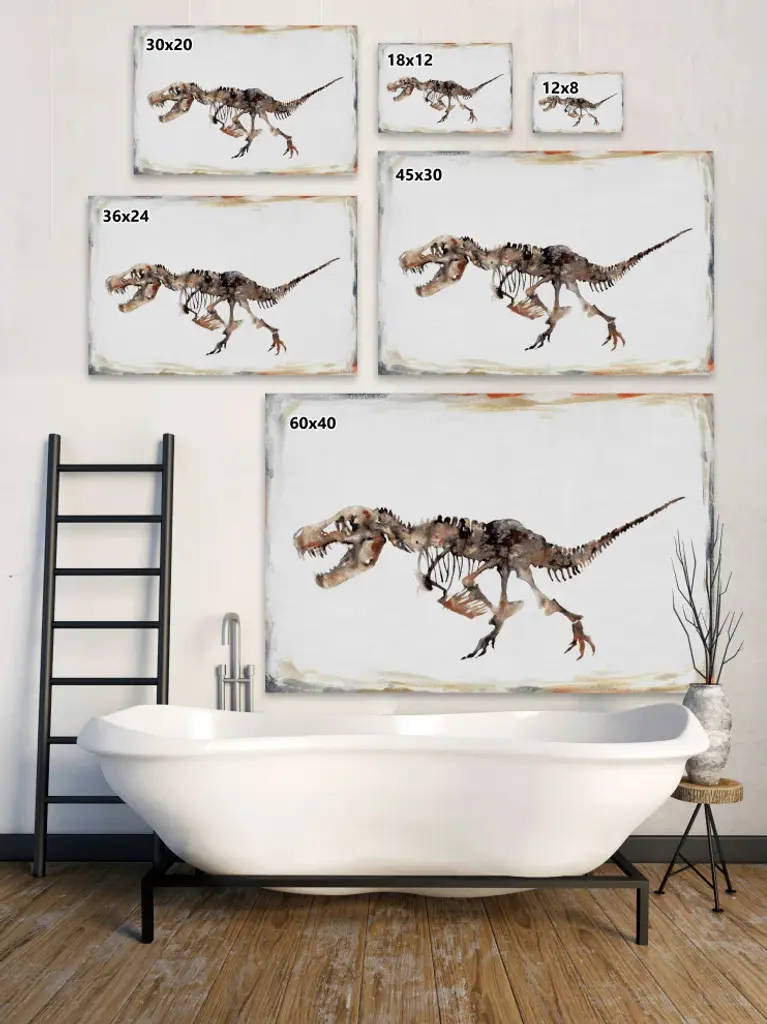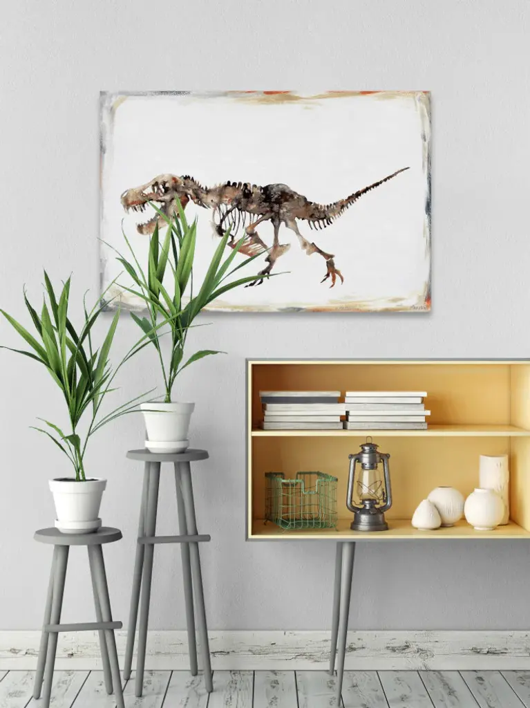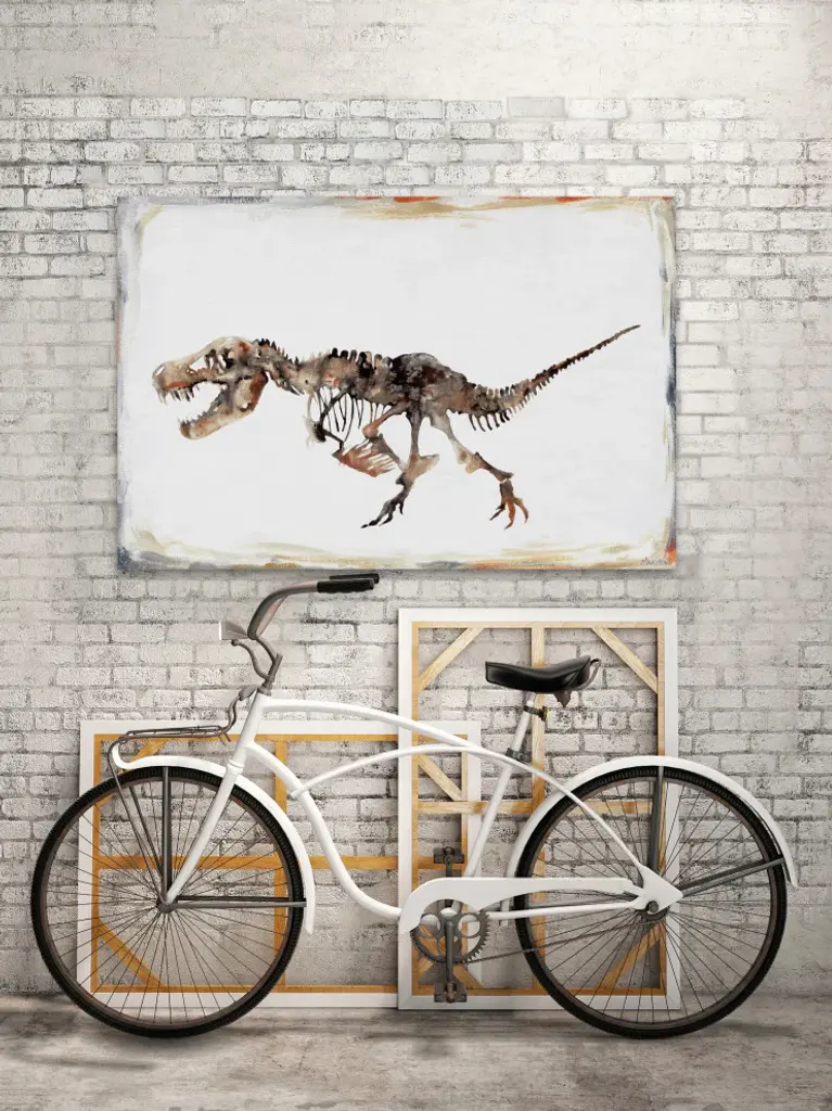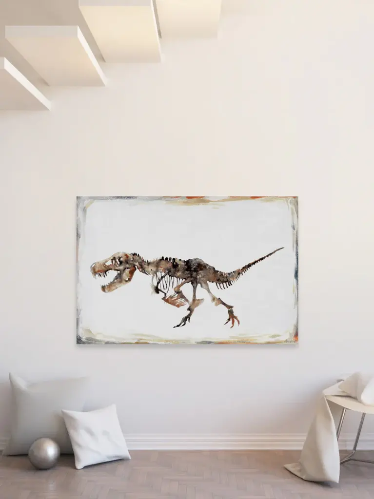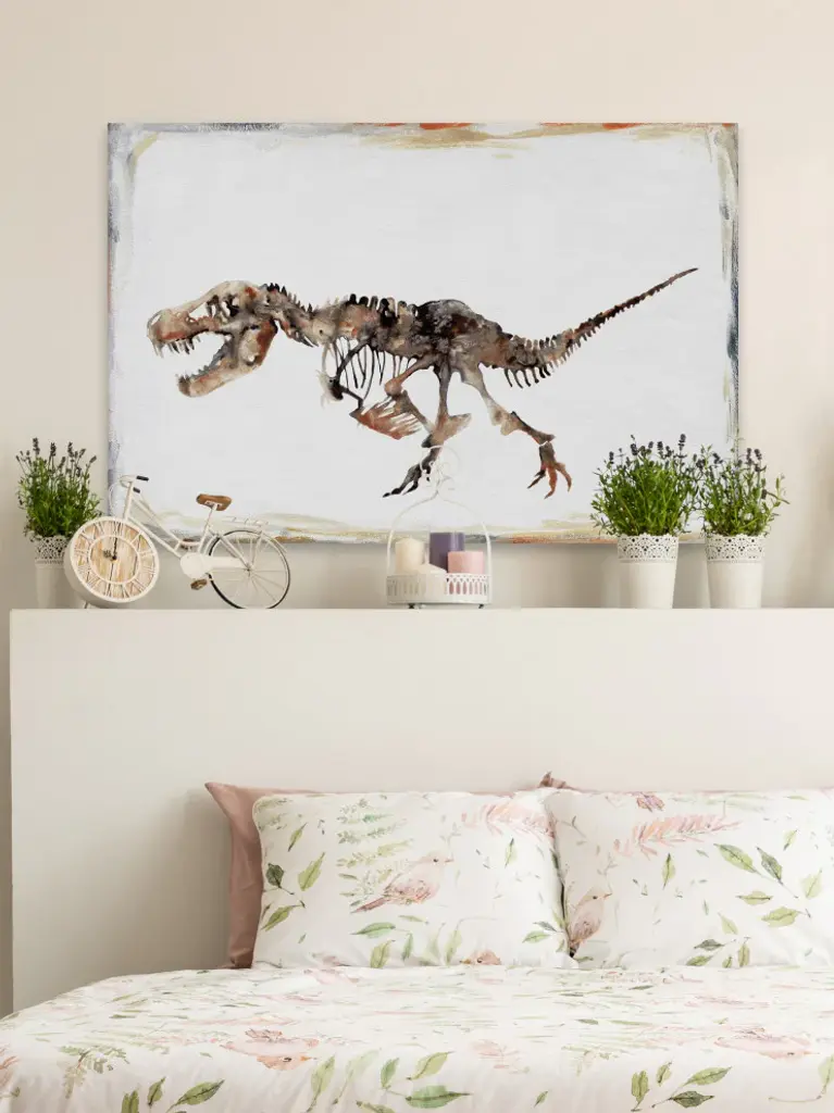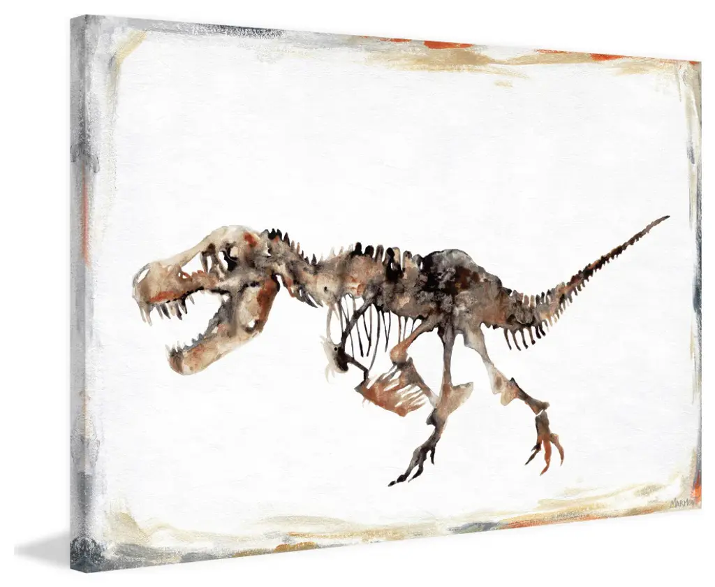 Perfect for younger children, this print features a detailed depiction of a dinosaur skeleton. Proudly made in the USA, this piece is printed on canvas before it''s stretched over non-warping wooden bars for a gallery-wrapped look. With wall-mounting hooks included, this artful accent is ready to hang up as soon as it reaches your front door.- Durable art print on high quality canvas- Professionally hand stretched- Arrives ready to hang- Gallery wrapped in sustainable, non-warping wood- Includes a certificate of authenticity- Made in the USA