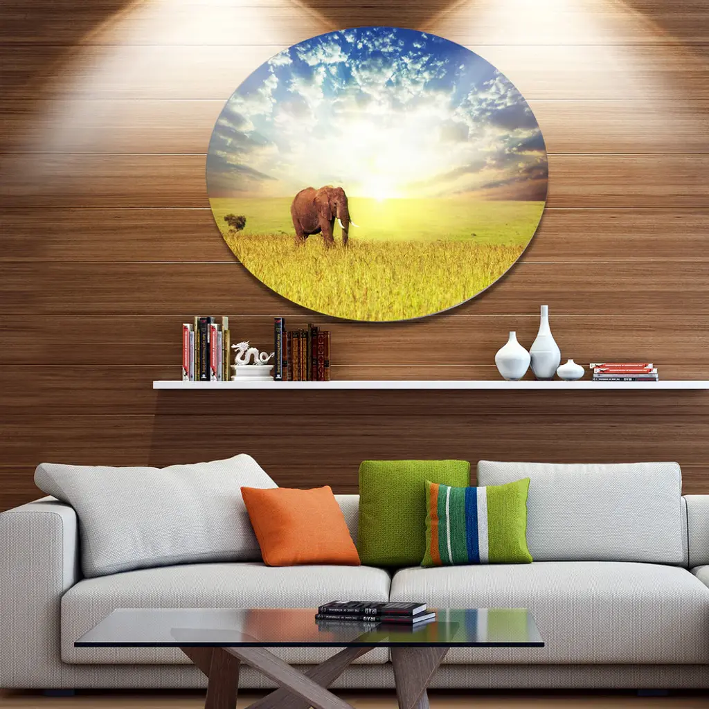 Savannah Elephant In Grassland, African Large Disc Metal Wall Art, 23"