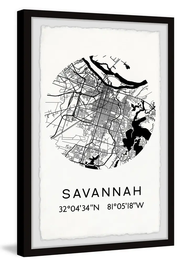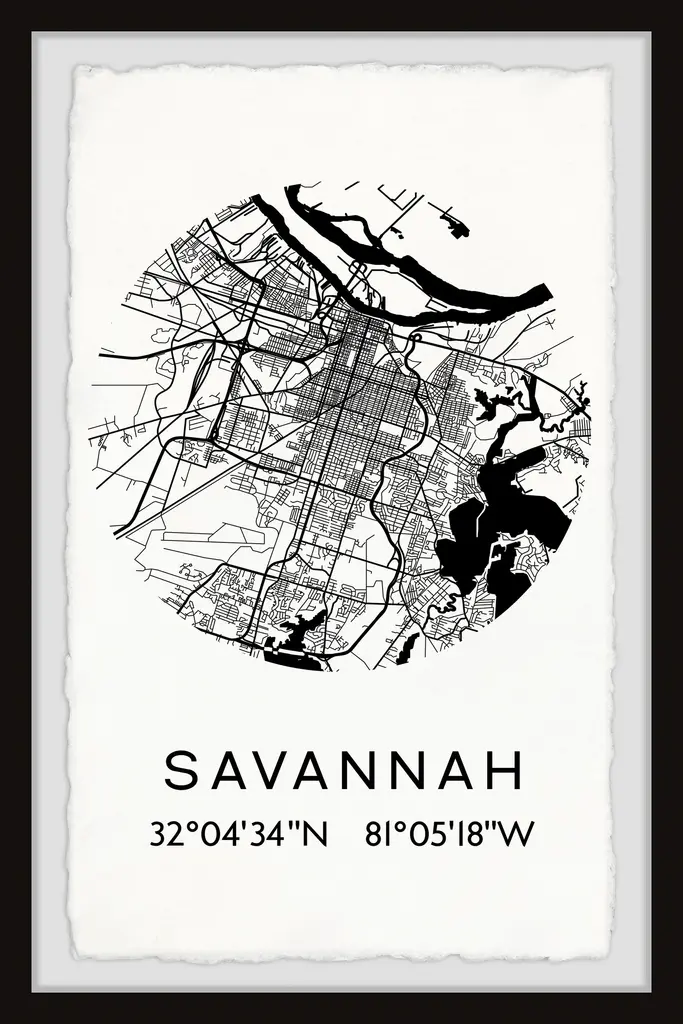 Put your favorite city on display with this textual print of Savannah, Georgia and its coordinates. This piece is printed on high quality archive paper and professionally hand-framed. With wall-mounting hooks included, this artful accent is ready to hang up as soon as it reaches your front door.Top quality Gicle print on high resolution Archive PaperHand cut deckled edgesHigh quality durable non-warping frameFinished under shatter resistant plexiglassArrives ready to hangIncludes a certificate of authenticityPrinted in the USA