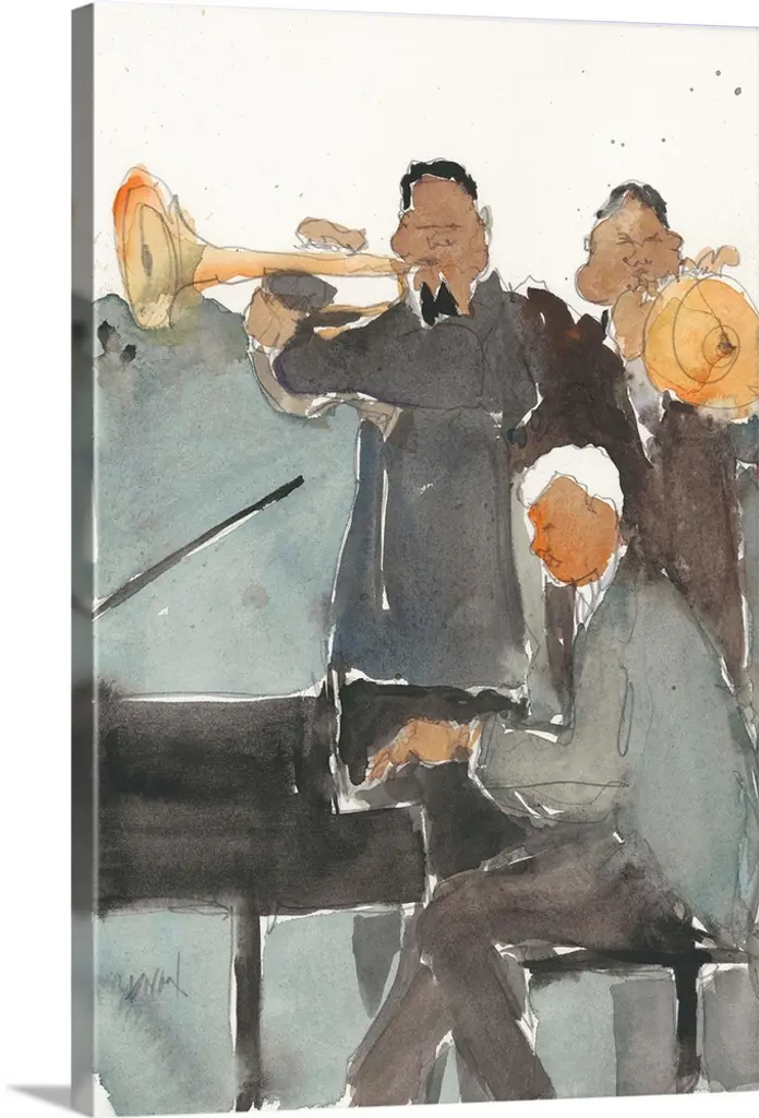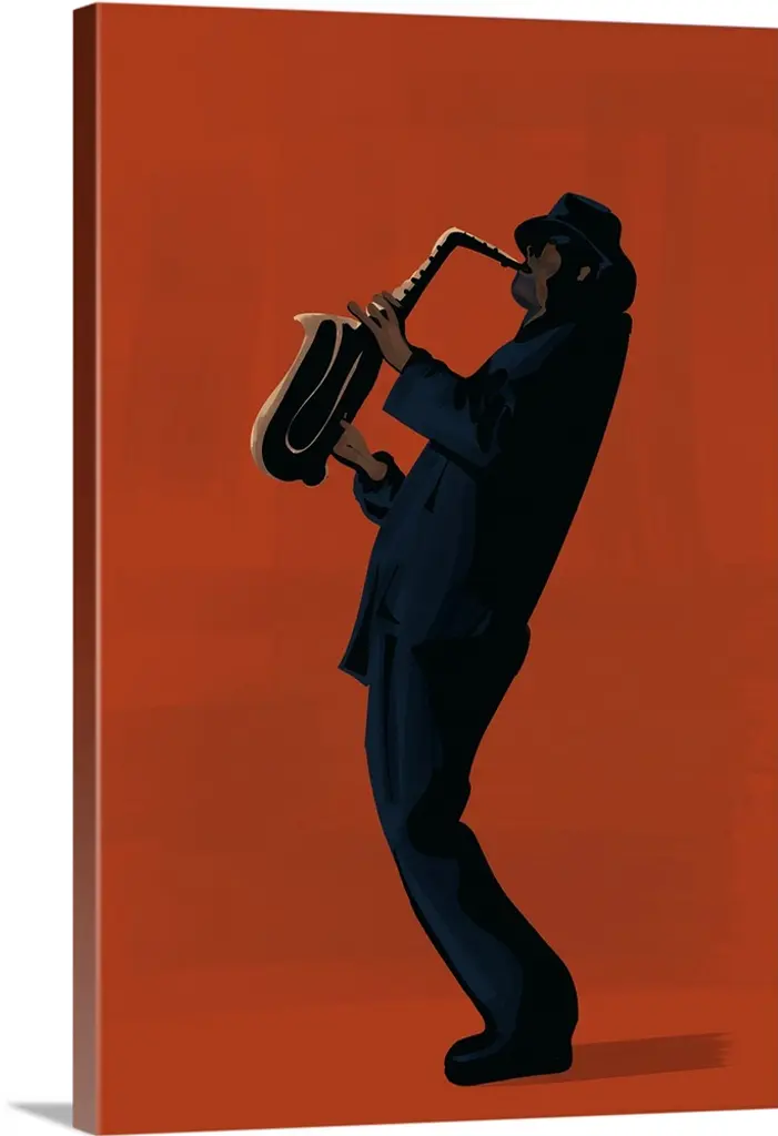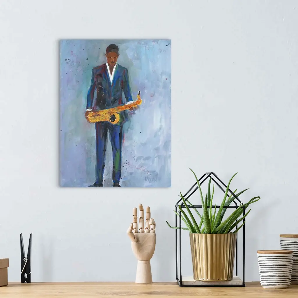 Contemporary artwork of a man in a blue suit holding a saxophone.