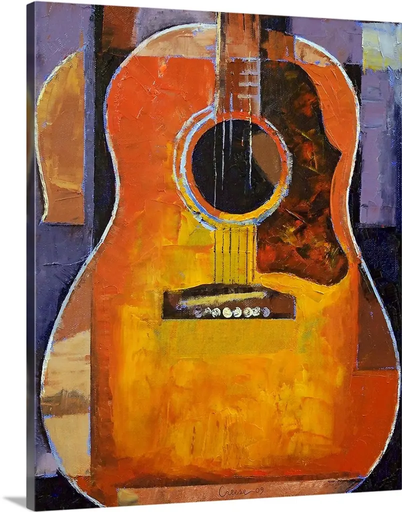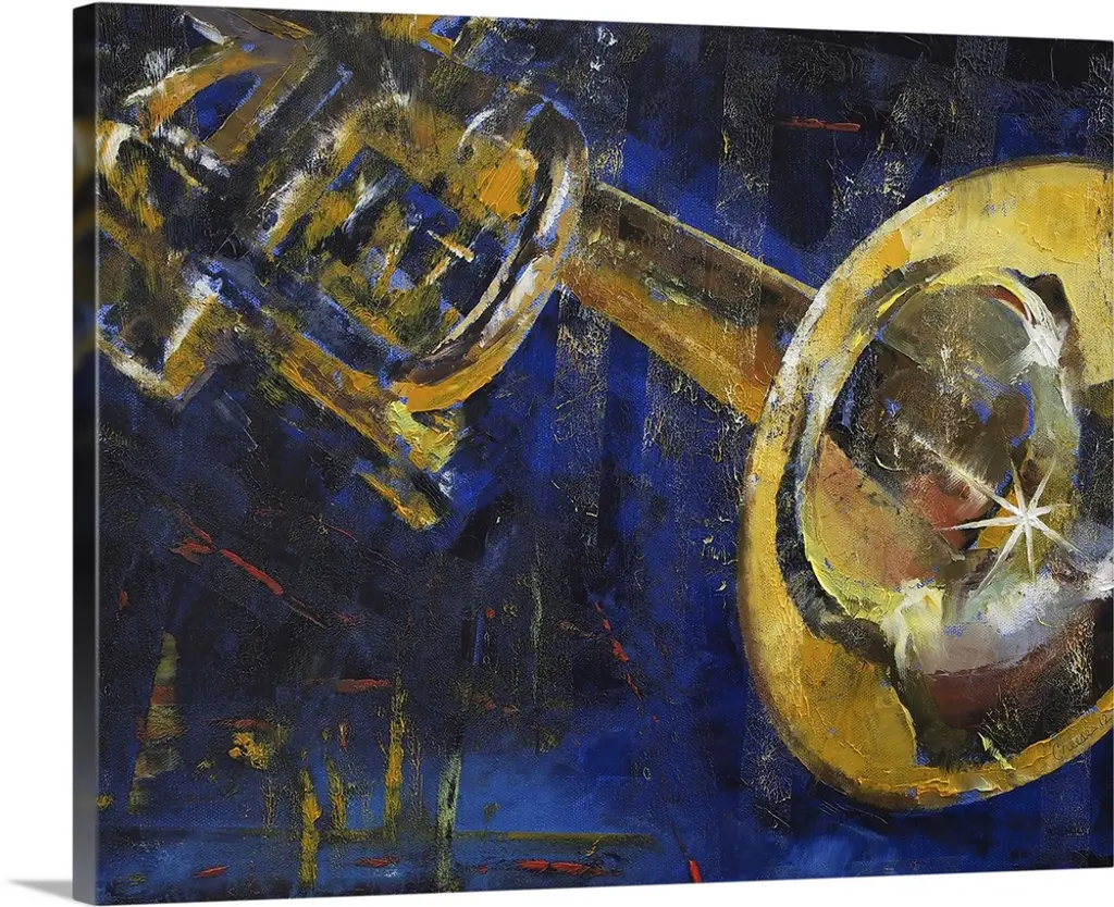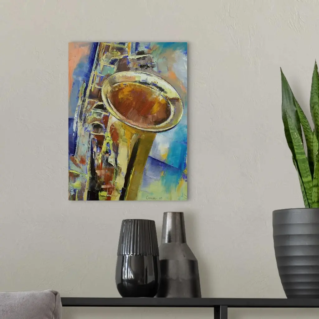 Contemporary oil painting of up-close view of saxophone. The multicolored image is created using short brush strokes of color.