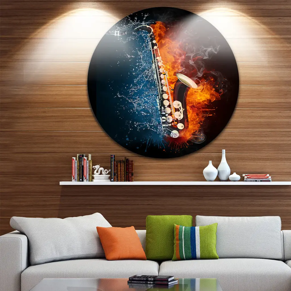 Bring Contemporary Abstraction to your home with this large Circle Metal wall art. This Saxophone Metal Artwork makes it the focal point of any room or office. - White Gloss Coating ensures colors are extra vibrant with light reflection.- Aluminum grade Sheet Metal with 1 inch mounting frame on the back giving the illusion that the artwork is floating on the wall..- Mounting Brackets are included along with instructions.- High Quality Digital images are created directly into a glossy aluminum panel producing a stunning and captivating print into the glossy finish of the metal.- Water, Fire and Scratch resistant HD Aluminum panels.- Looks better than any photo paper and guaranteed to last at least 20 years- Easy to clean with a microfiber cloth. Colors are far superior to regular Canvas Art. - Easy to Hang