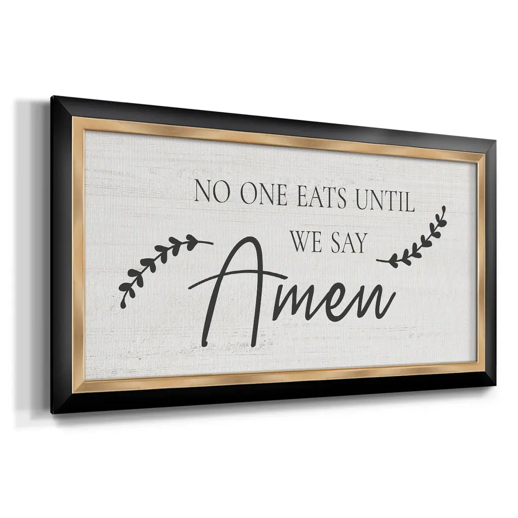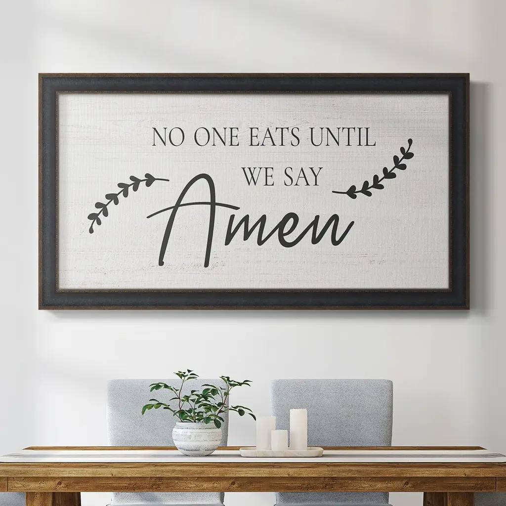 Say Amen Premium Framed Canvas- Ready to Hang A Premium Framed Canvas created to last. Framed in distressed wood and available in an array of sizes and colors Featuring a beveled a solid wood stretcher bar, each piece comes ready to hand 3 SIZES AVAILABLE 21''X37'' - Overall Size 25''X45'' - Overall Size 29''x53'' - Overall Size Each piece is made to order. Each piece comes with hanging hardware. Made in the USA Ready to Hang Giclee Paper Print Acrylic Glass Beveled Matt Board