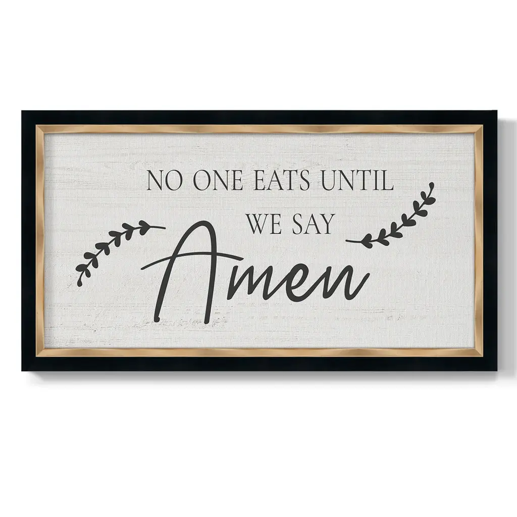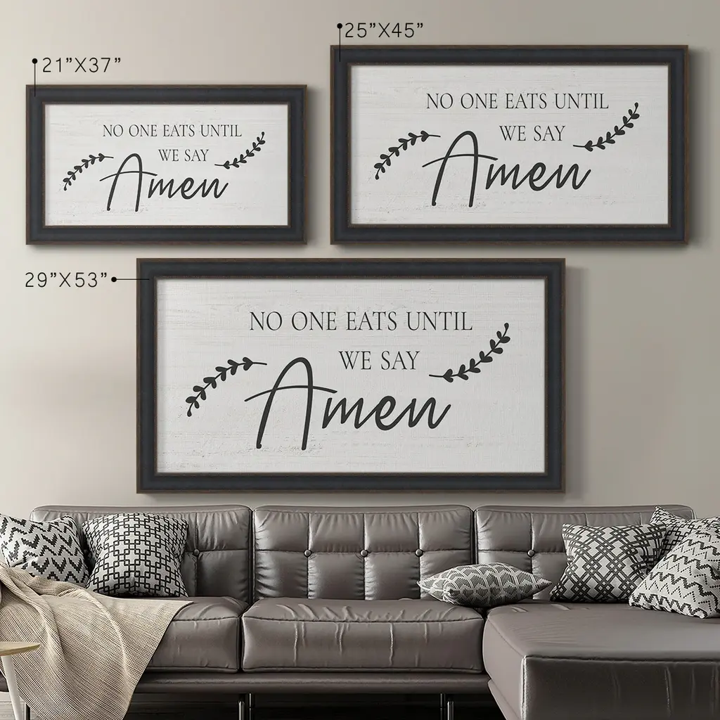 Say Amen Premium Framed Canvas- Ready to Hang A Premium Framed Canvas created to last. Framed in distressed wood and available in an array of sizes and colors Featuring a beveled a solid wood stretcher bar, each piece comes ready to hand 3 SIZES AVAILABLE 21''X37'' - Overall Size 25''X45'' - Overall Size 29''x53'' - Overall Size Each piece is made to order. Each piece comes with hanging hardware. Made in the USA Ready to Hang Giclee Paper Print Acrylic Glass Beveled Matt Board