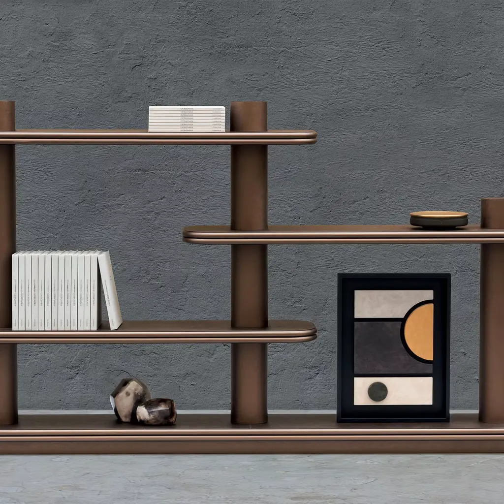 A multi-tier design that offers a stylish place to display books, art pieces, and collectibles, this bookcase is part of the Scala Collection of leather furniture designed by Stéphane Parmentier. Featuring a glamorous bronzed color, the nappa leather silhouette is defined by an open, freestanding construction with three staggered shelves intersected by three bold cylinders. This bookcase is only available in printed calfskin, suede, and nappa.