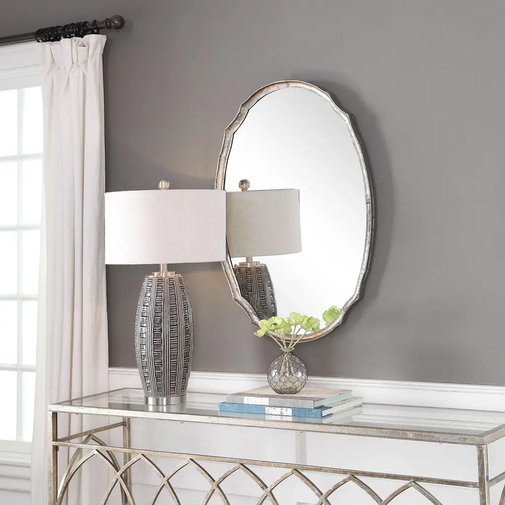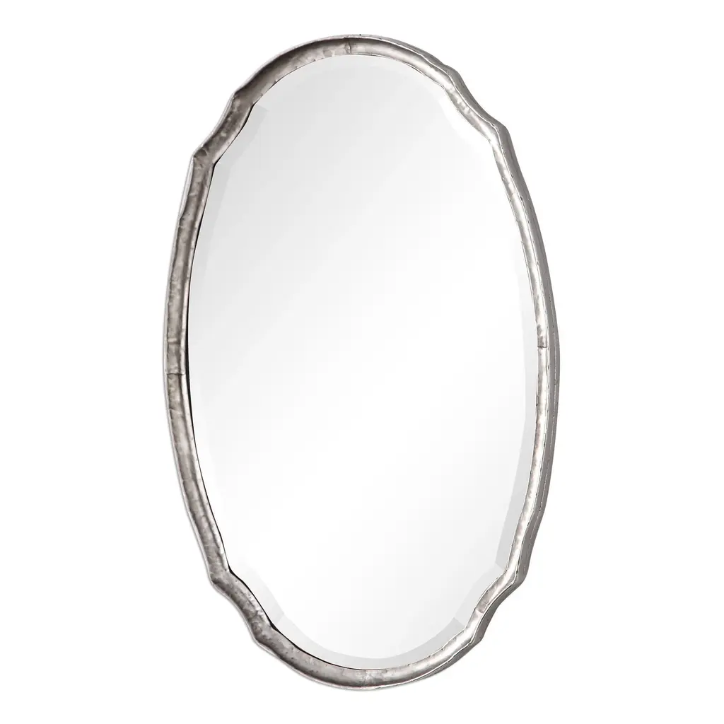 This oval shaped, silver frame, is made of hammered metal and features a concave surface. The mirror has a generous 1.25" bevel. May be hung either vertically or horizontally. Also available here on our shop in charcoal and gold leaf. Antique, vintage, designer floor samples & new products from one of the hottest Retail and To The Trade Home Furnishings showrooms in the country. Located in Chicago's chic Roscoe Village, Kenneth Ludwig Chicago carries the best offerings in furniture, accessories, artwork & textiles. Offerings are always fresh & always inspiring! Quite often ( due to a discontinued style, fabric or frame ) they must sell off their showroom floor samples. You receive first quality pieces at amazing prices. Check back weekly for new inventory added.