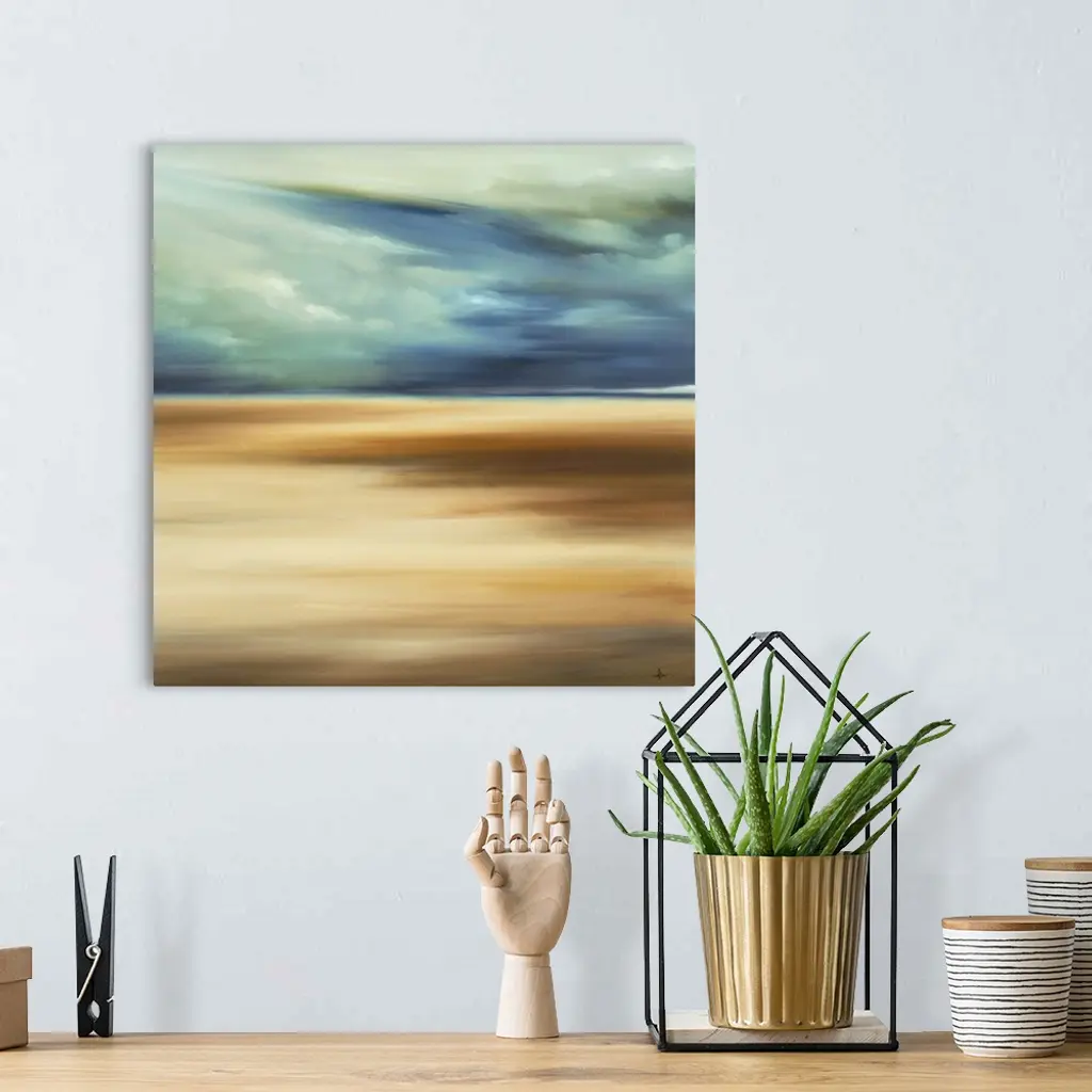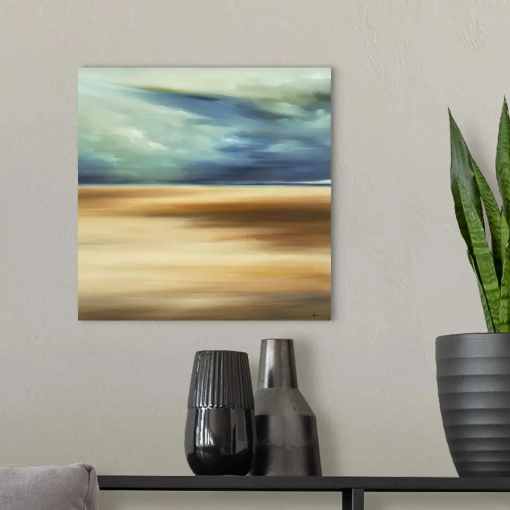 Contemporary abstract painting depicting a sandy beach with the ocean in the distance under a cloudy sky.