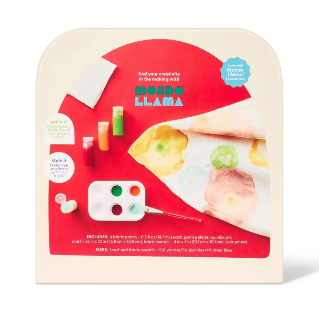 Showcase your painting interests with the Scarf Fabric Paint Dye Craft Kit from Mondo Llama™. This paint dye craft kit includes an instruction manual, paint, paintbrush, paint palette and scarf to help provide the essentials for painting. Simply create colorful patterns and flaunt it as you head out or gift it to a loved one. Mondo Llama™: Find your creativity in the making.