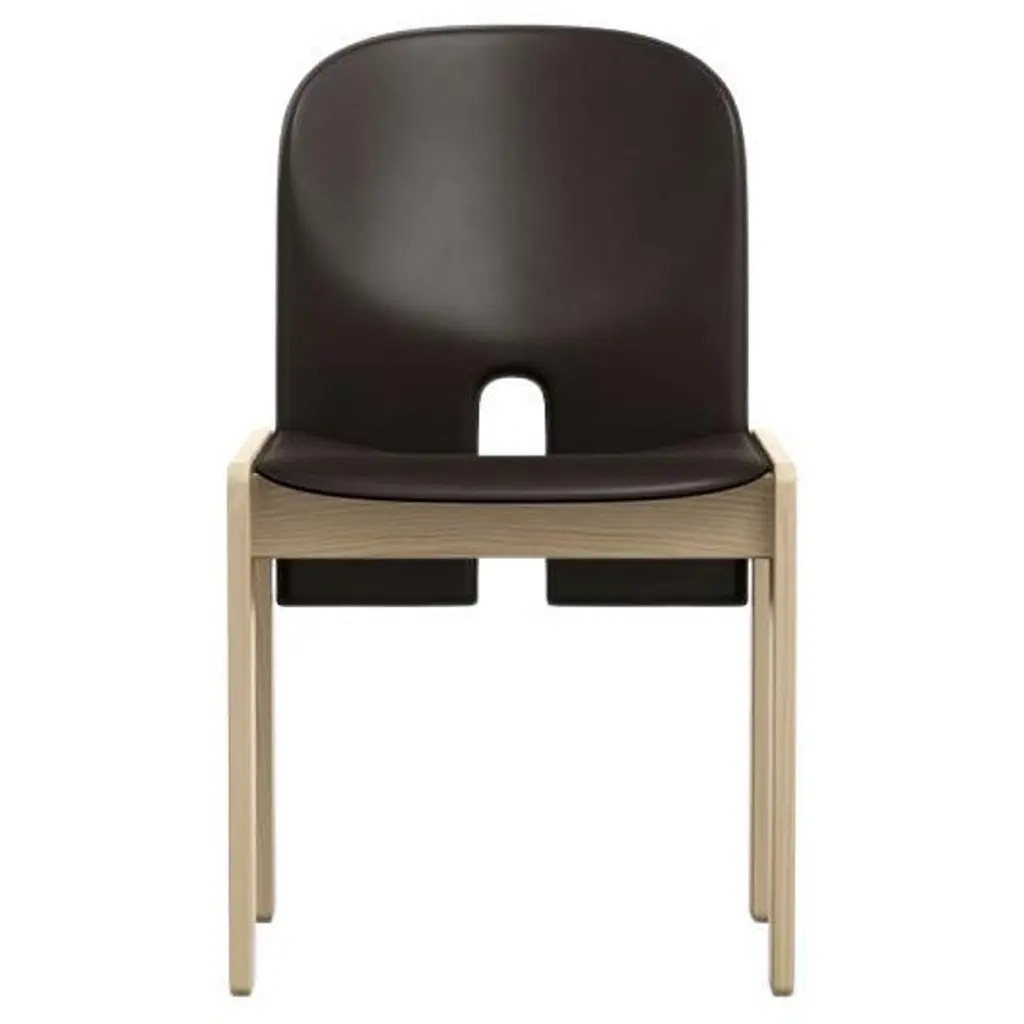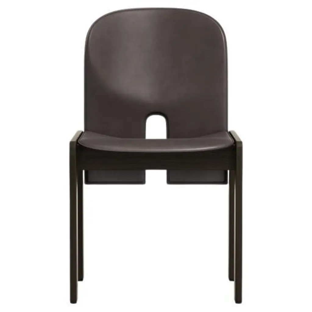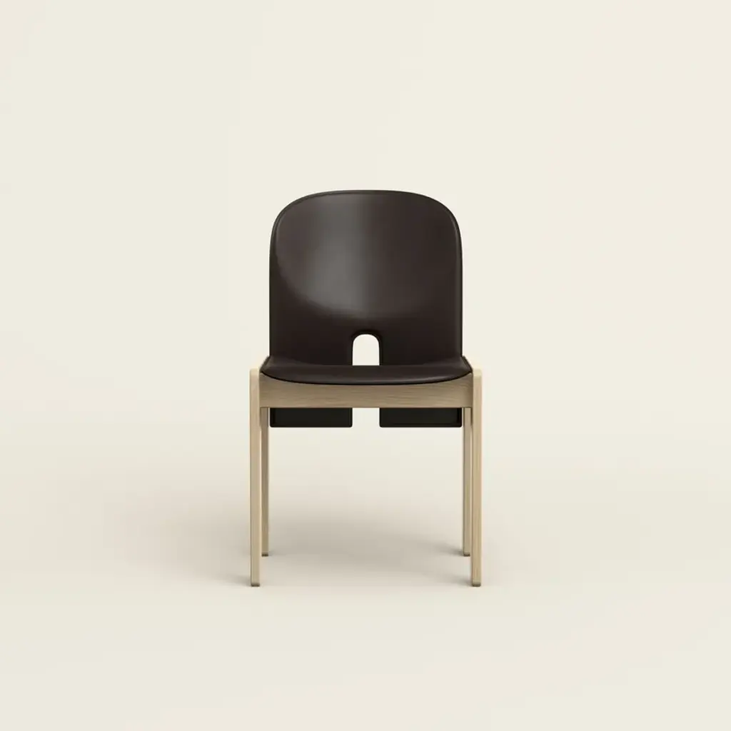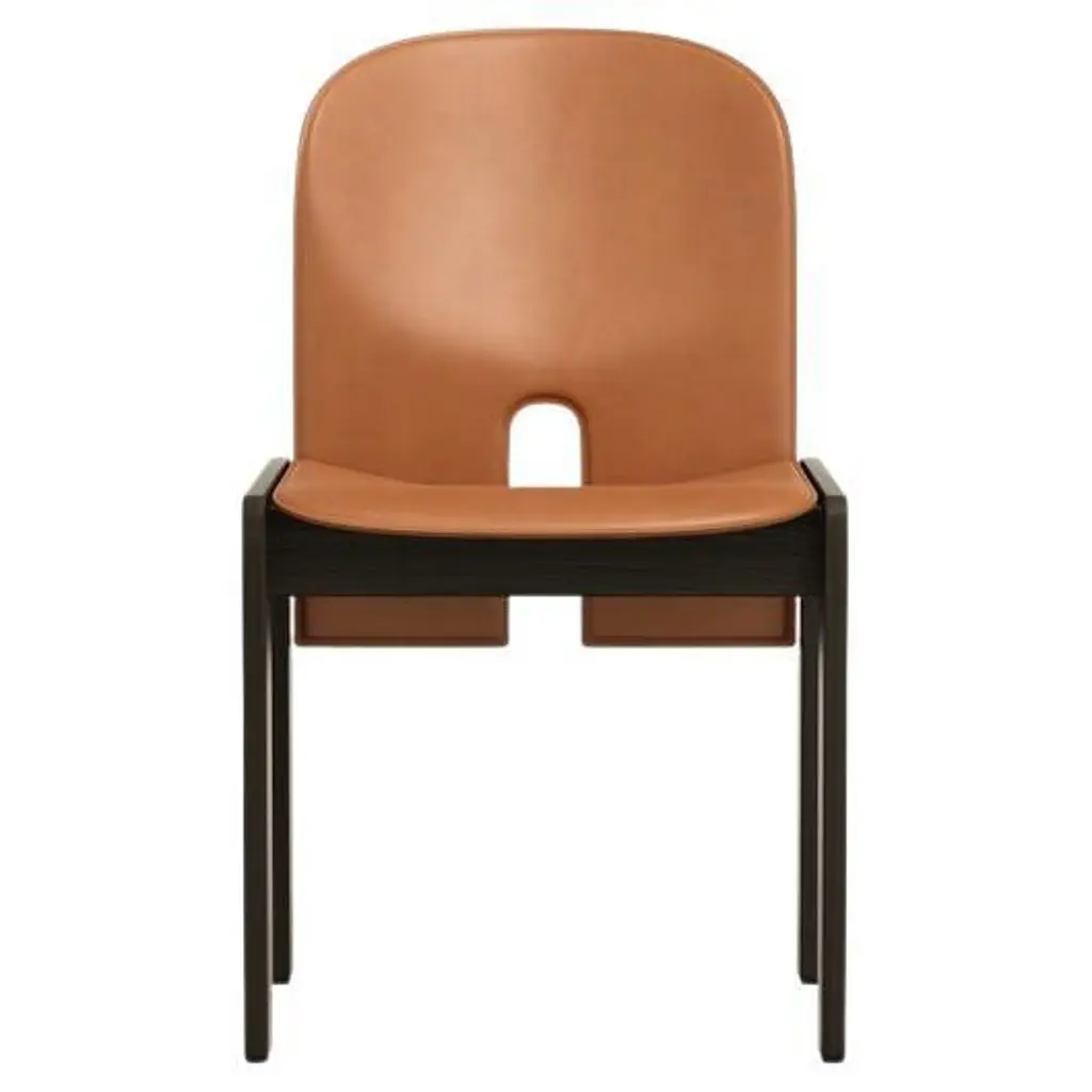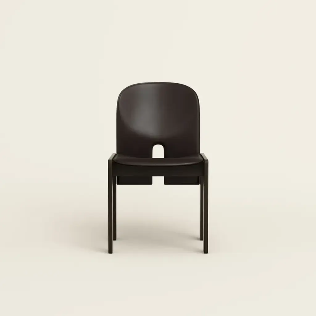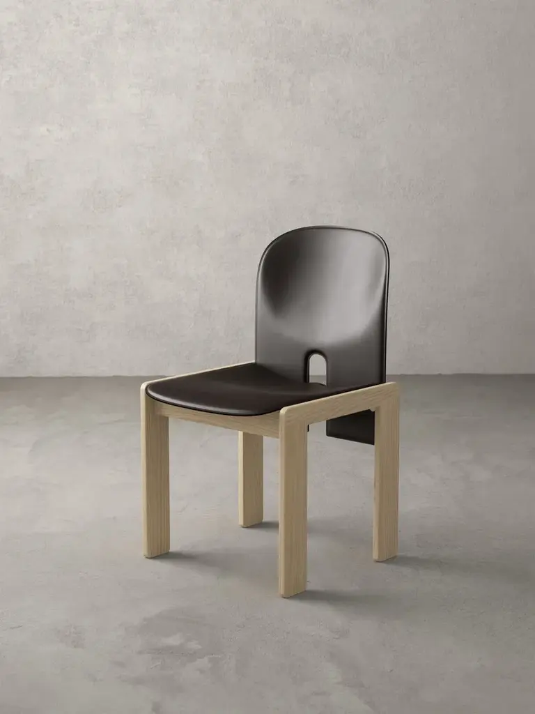 The iconic Scarpa 121 dining chair is a straightforward dining chair with a design that can complement both classical and cutting-edge interiors. The design is characterized by a firm and robust wooden frame that creates a striking contrast to the lightness of the seat and back. The seat and back are anatomically shaped in plywood, covered in fine European leather, and attached by bolts to crosspieces along the center for great comfort. Originally inspired by a sketch made by Tobia’s father, Venetian architect and designer, Carlo Scarpa, the 121 came to life with a distinct touch from Afra and Tobia Scarpa in 1965.The 121 Scarpa dining chair was designed alongside the classic 925 Scarpa lounge chair from 1966. The two chairs are a prime example of Afra and Tobia Scarpa’s work and share the same double trestle structure with characteristic rounded joints. Both designs are now a part of the Karakter collection.Material: Frame in solid ash, plastic glidesUpholstery: Saddle leatherOn sale from September 2023