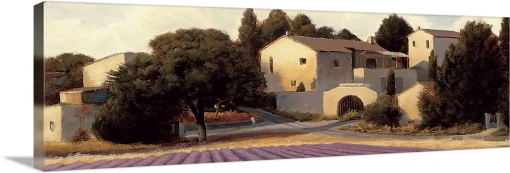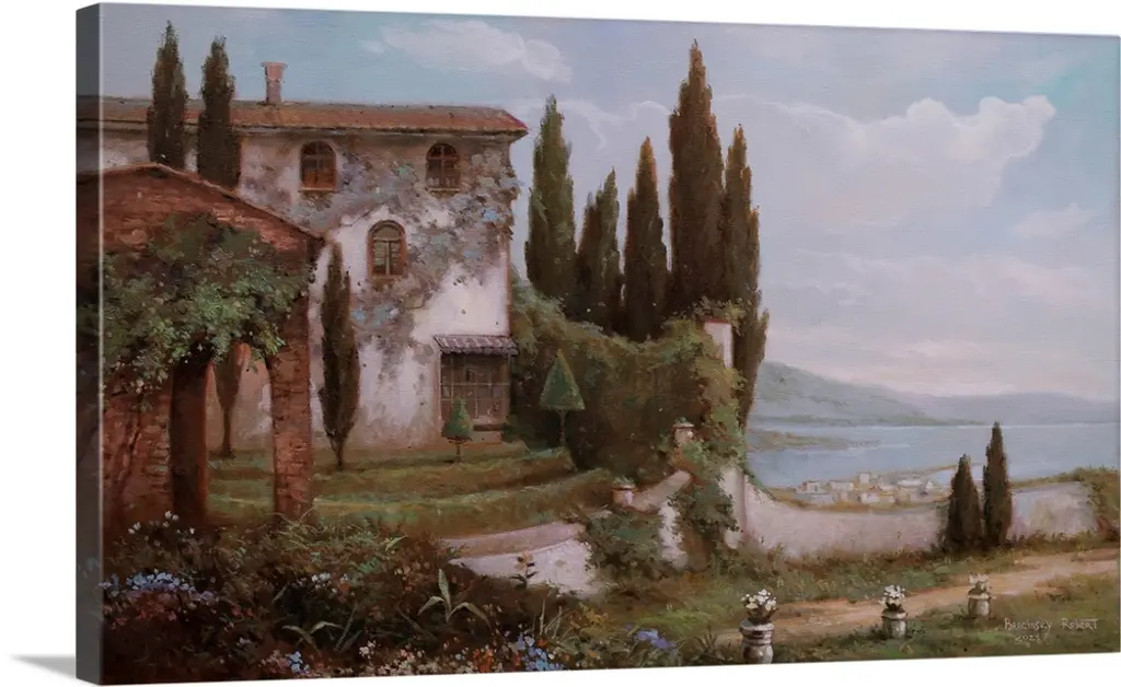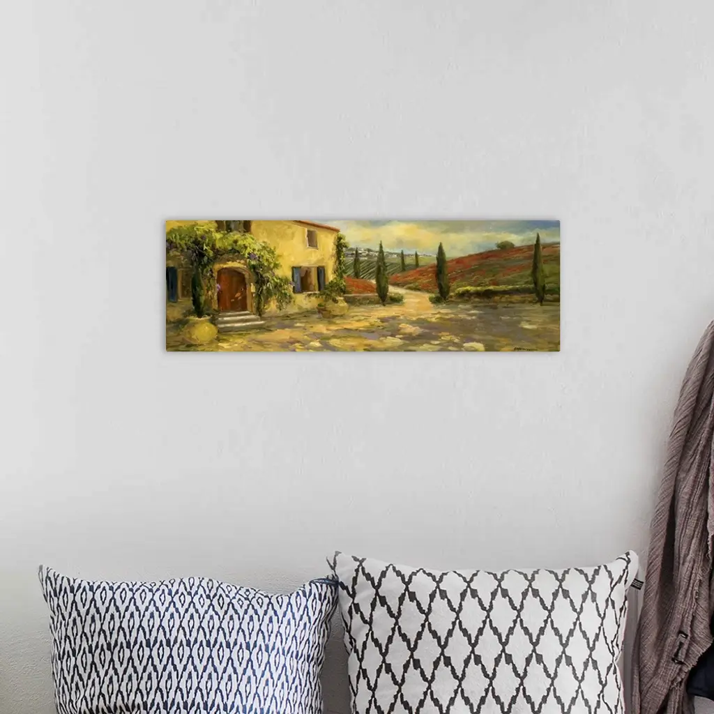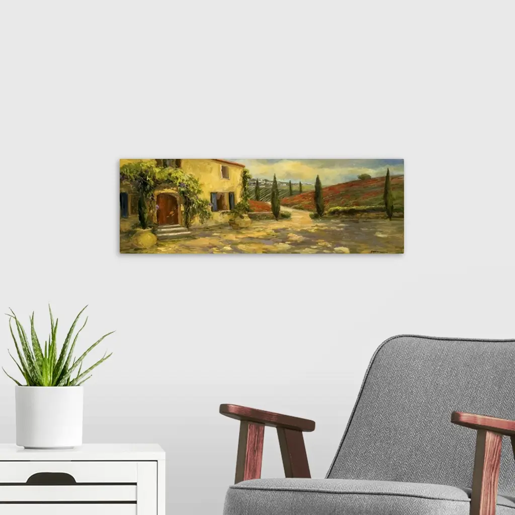 A modern painting in a traditional style of a house and rolling hills in the Italy countryside.