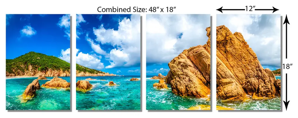 48"œ x 18"œ total size. Ready To Hang! (4 pieces - 12"œ x 18"œ each). 4 Panel Split Metal Print of a scenic ocean coastline in paradise. Modern metal wall art for home or office wall decor & interior design. Printed on Luxurious, HD aluminum glossy metal panels. Multi panel art.. HD aluminum panels. Metal print wall art. Includes Shadow Wall Mount on the back.• Aluminum Metal Wall Art• Made in USA• Ready to hang - No assembly required• Shadow mount hardware on the back• 0.045"œ thick HD Aluminum Panels• Scratch resistant, glossy finish• Superb color clarity, luxurious prints• Epson printing process• For indoor or moisture rich environment use• Easy to clean. Gently wipe with microfiber cloth.