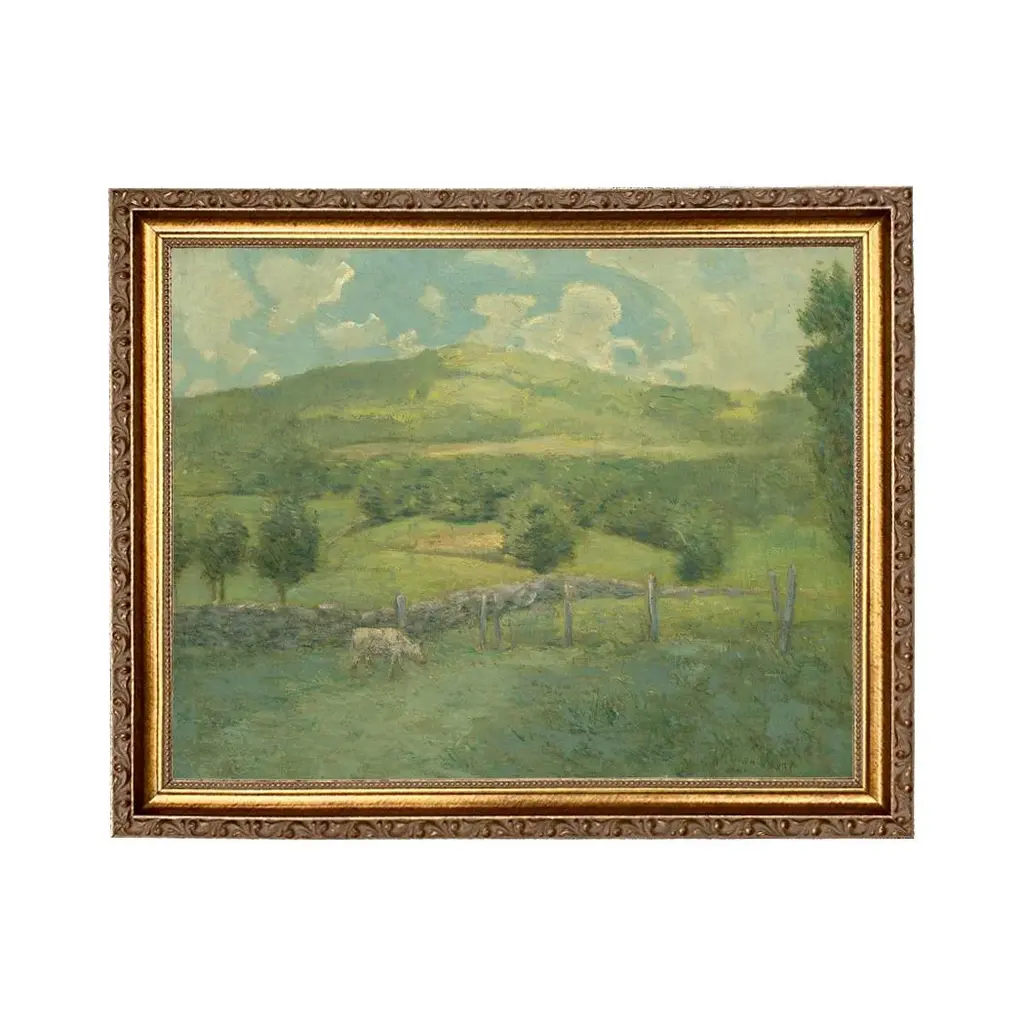 Accurate print reproduction of the original oil painting by American impressionist painter Julian Alden Weir (1852-1919), this image is printed on canvas, mounted to a board and treated with a historic looking varnish. Framed in a thin gold wood frame, the back is finished with craft paper and a sawtooth hook. Made in the USA. • Painting print: 11" x 14" • Finished frame size: 13" x 16" • Frame width: 1-1/4" • Frame thickness: 1"