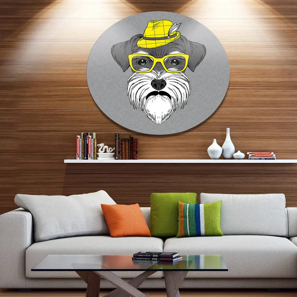 Bring Contemporary Abstraction to your home with this large Circle Metal wall art. This Schnauzer with Hat and Glasses Metal Artwork makes it the focal point of any room or office. - White Gloss Coating ensures colors are extra vibrant with light reflection.- Aluminum grade Sheet Metal with 1 inch mounting frame on the back giving the illusion that the artwork is floating on the wall..- Mounting Brackets are included along with instructions.- High Quality Digital images are created directly into a glossy aluminum panel producing a stunning and captivating print into the glossy finish of the metal.- Water, Fire and Scratch resistant HD Aluminum panels.- Looks better than any photo paper and guaranteed to last at least 20 years- Easy to clean with a microfiber cloth. Colors are far superior to regular Canvas Art. - Easy to Hang