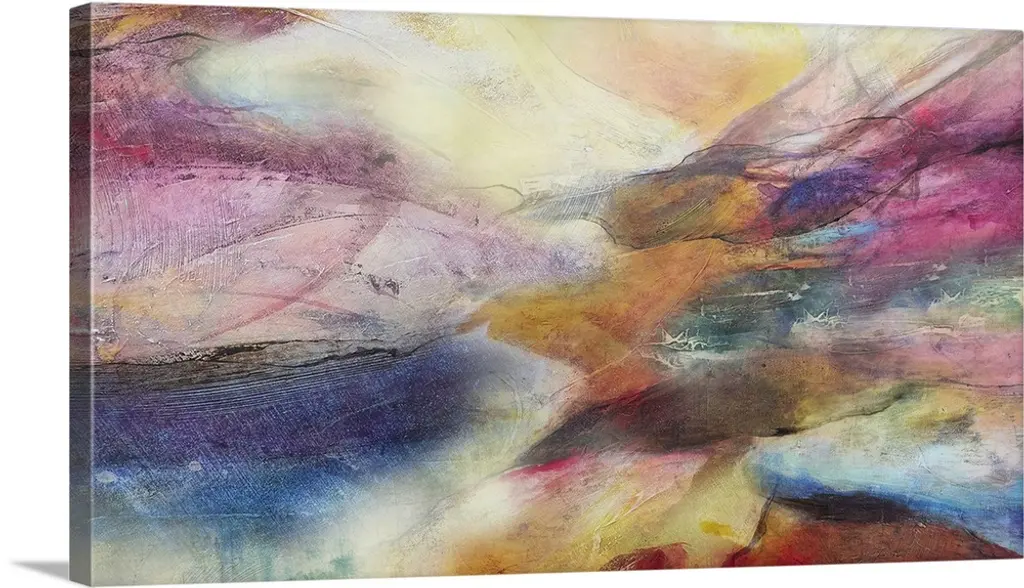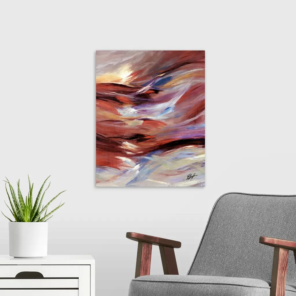 Vertical, oversized artwork for a living room or office of horizontal, wavelike brushstrokes in warm tones that meet roughly in the middle.