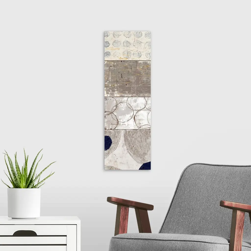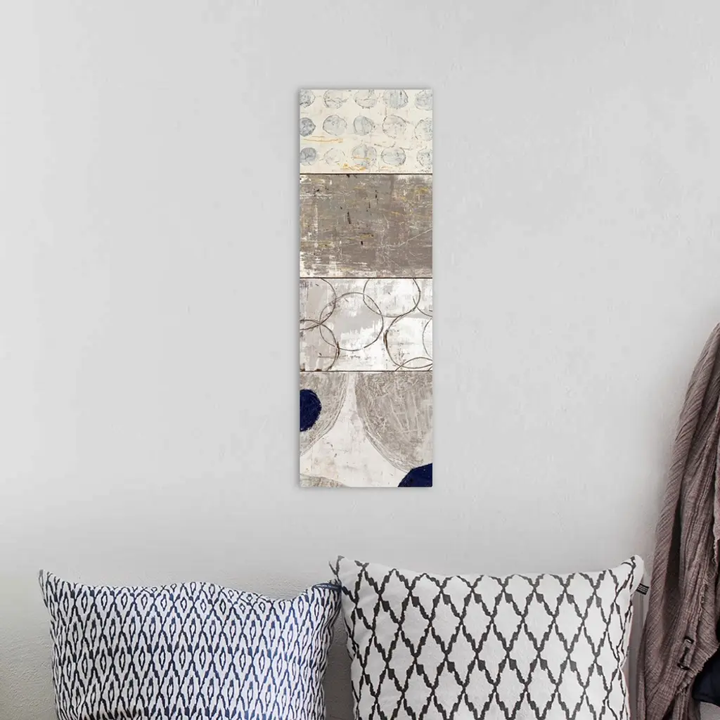 Vertical panoramic painting of four squares stacked on top of each other. Each square is filled with a pattern made of circles.