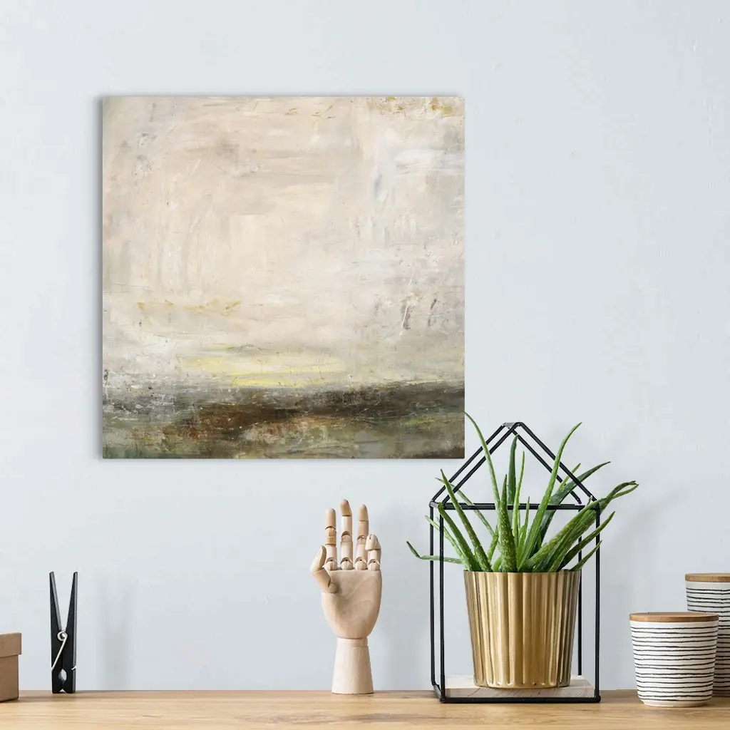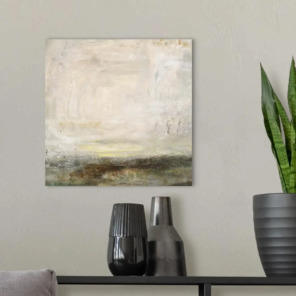 Abstract painting of a bare landscape beneath a light, cloudy sky as the sun is setting on the horizon.