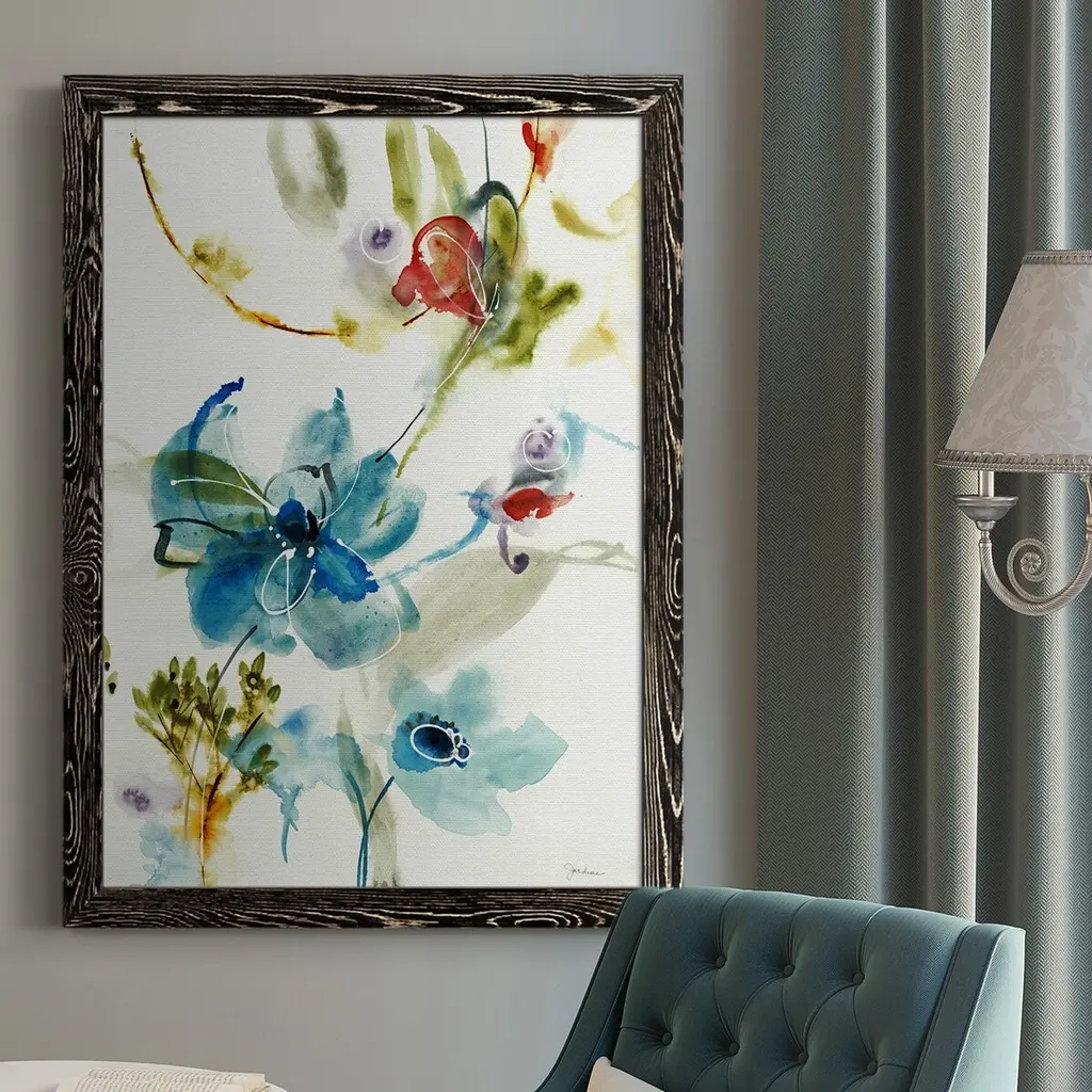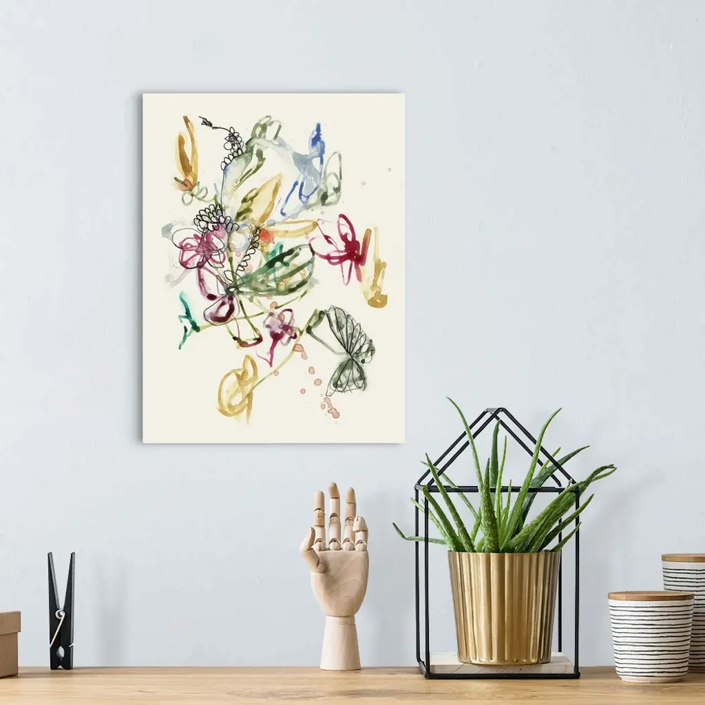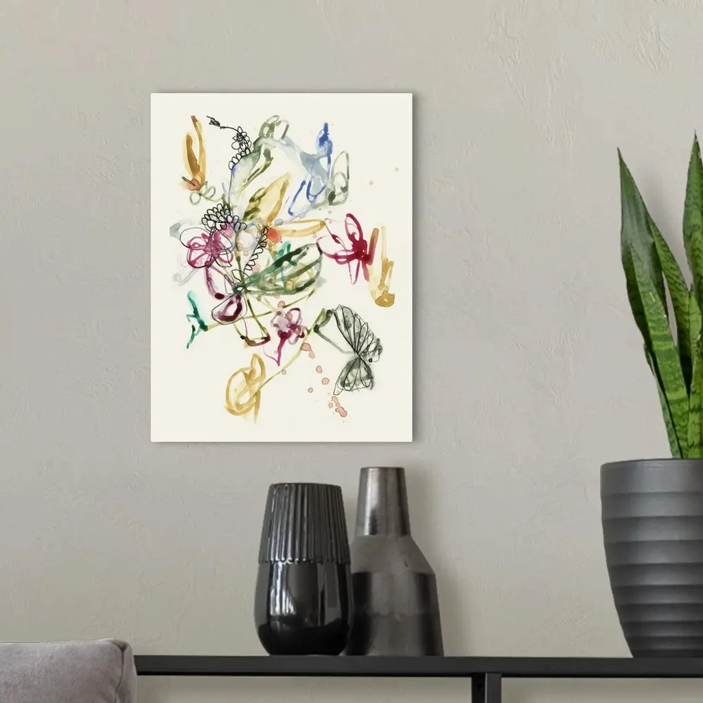Contemporary painting of abstracted flowers in a variety of colors against a cream toned background.