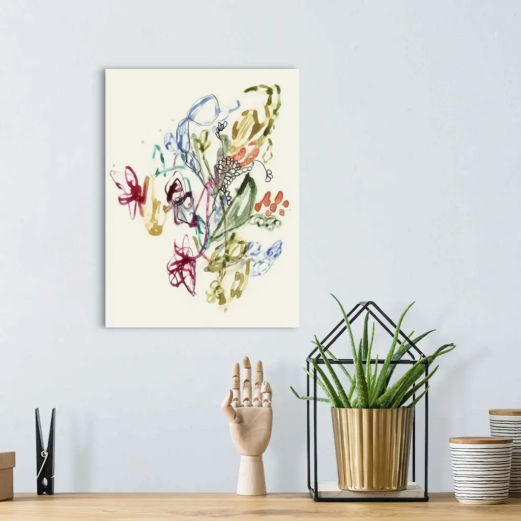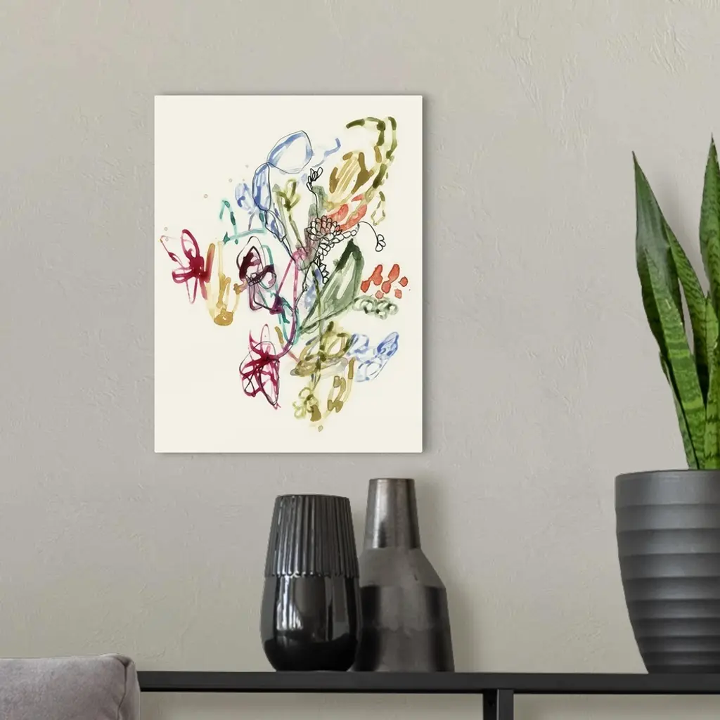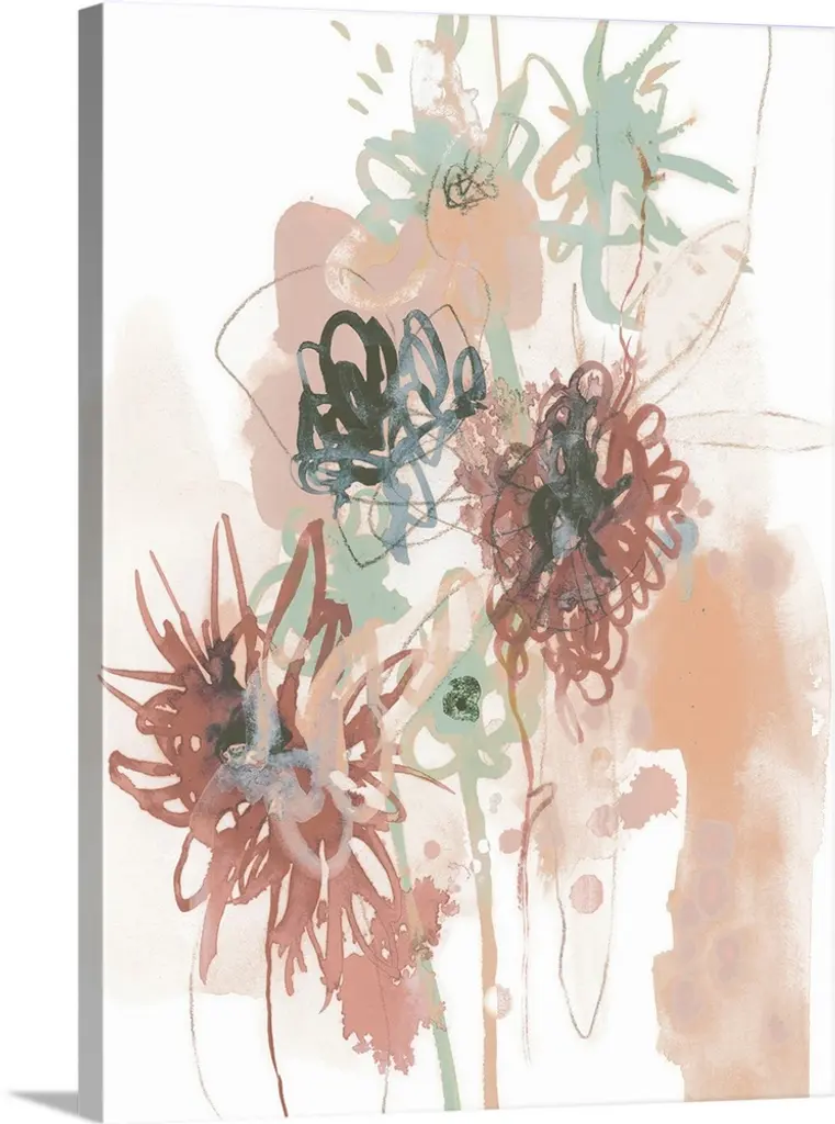 Contemporary painting of abstracted flowers in a variety of colors against a cream toned background.